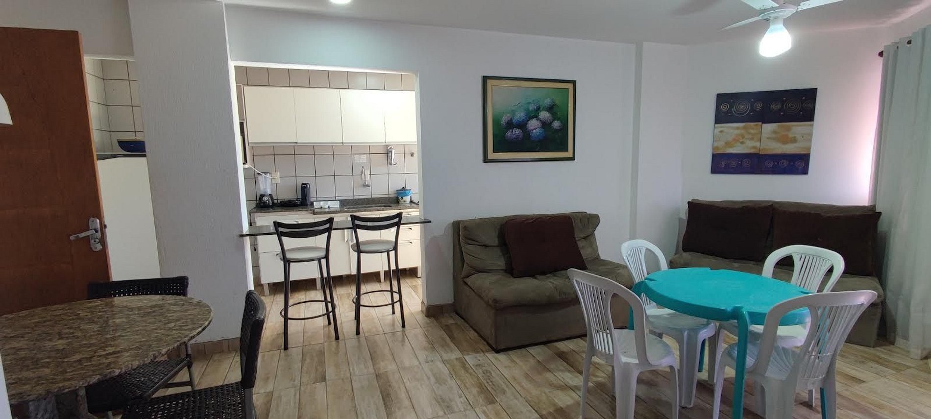 suite de casal com ar condicionado, quarto de solteiro com ar-condicionado, 02 camas, banheiro social, sala com ar condicionado, TV, 01 sofá cama de casal e 01 de solteiro, sacada. Cozinha com geladeira, fogão, microondas e utensílios básicos.