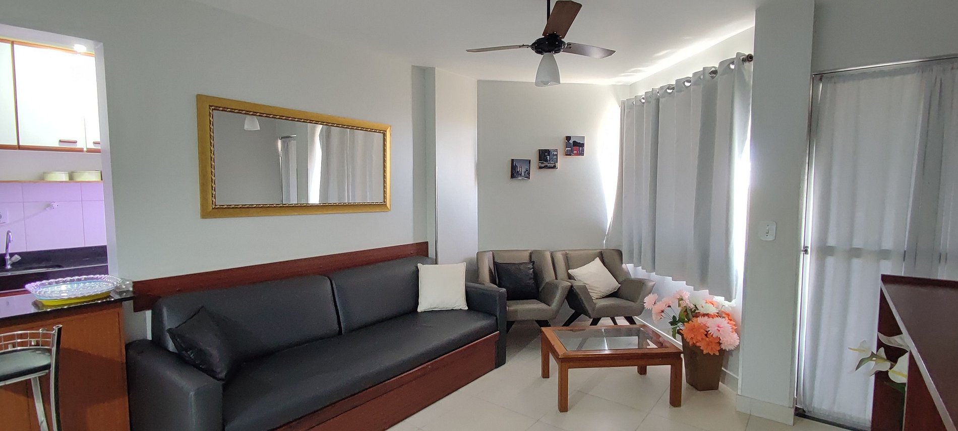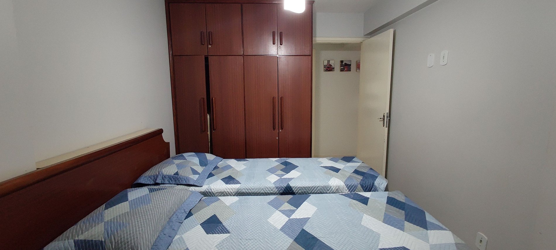 -suite de casal com ar condicionado, quarto de solteiro com 02 camas, banheiro social, sala com TV, 01 sofá cama de casal e 01 de solteiro, sacada. Cozinha com geladeira, fogão e utensílios básicos.