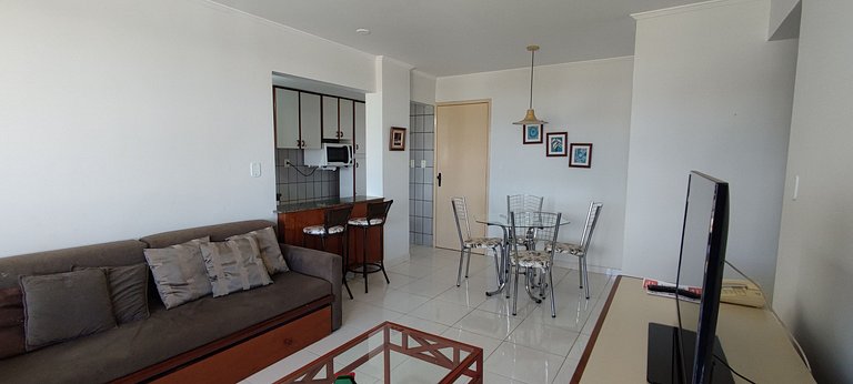 Um belo e amplo apartamento no condomínio Império Romano de 2 quartos sendo: 01 suite de casal com ar condicionado, quarto de solteiro com camas e auxiliar, banheiro social, sala com tv, sofá cama de casal, mesa e cadeiras, uma sacada. Cozinha completa com geladeira, microondas e fogão (possui utensílios básicos de cozinha).