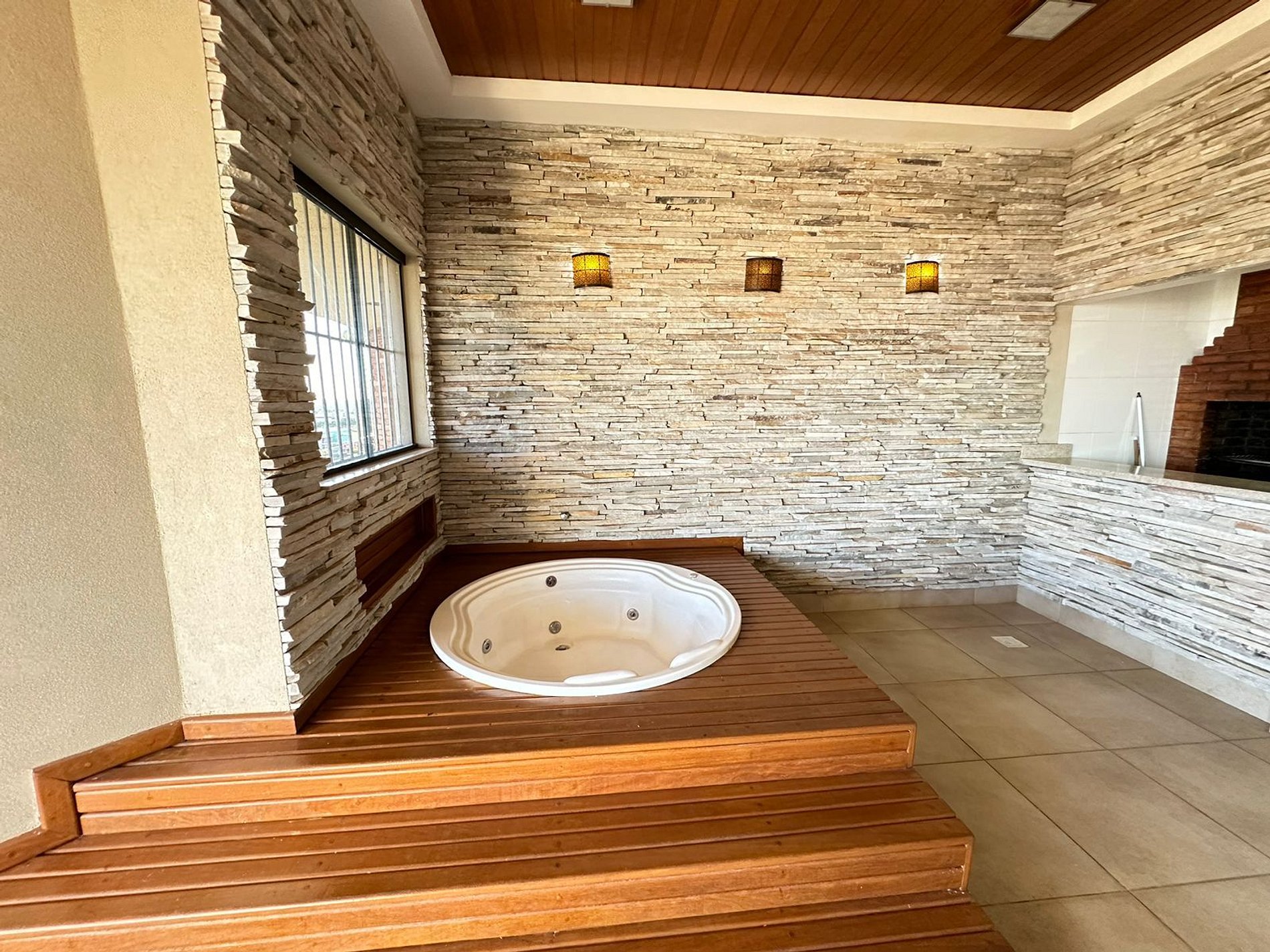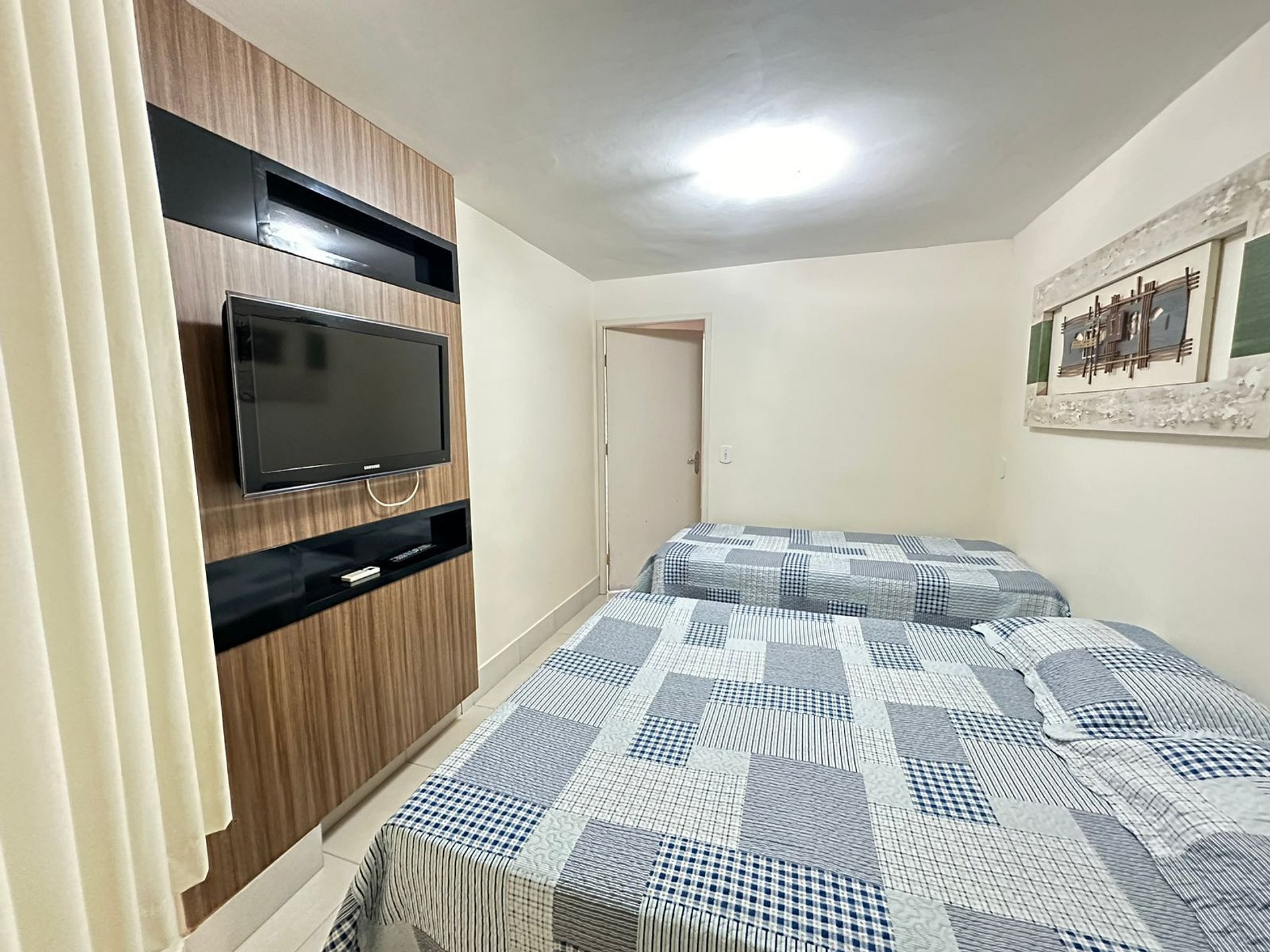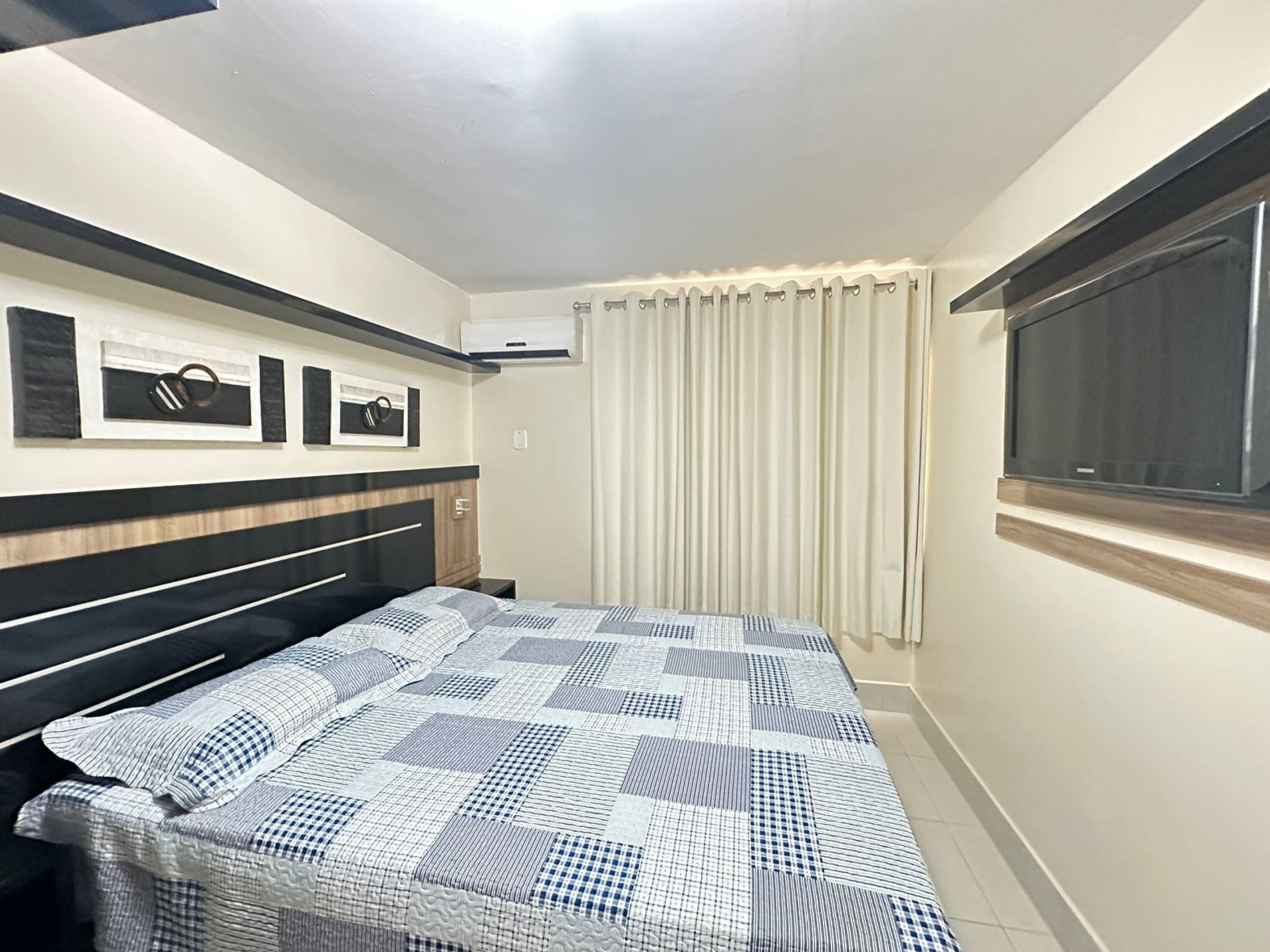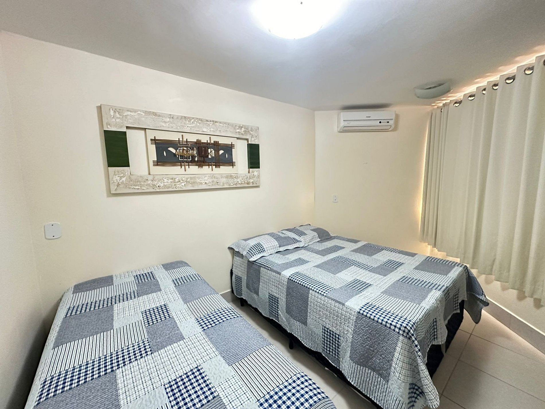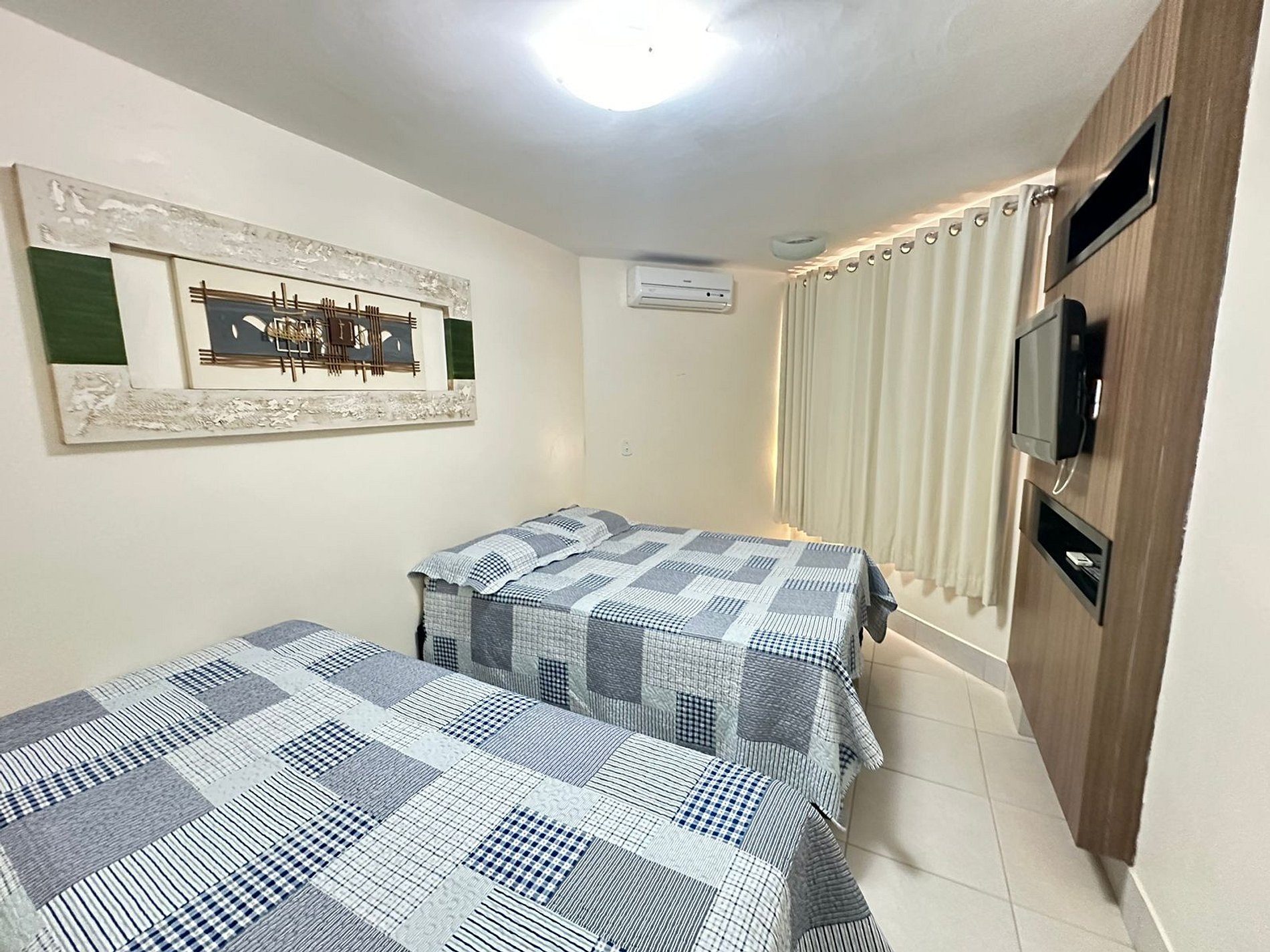 Piso inferior 1 quarto solteiro com 2 camas, 1 suíte casal com TV e ar-condicionado, cozinha completa, sala com TV, sofá com cama auxiliar, 1 banheiro. Piso superior 1 quarto com 1 cama de solteiro, 1 cama de casal, TV e ar-condicionado, 1 suíte casal com TV e ar-condicionado, 1 lavabo, sacada com churrasqueira, pia, geladeira, fogão elétrico 2 bocas, mesa com 4 cadeiras, ofurô.