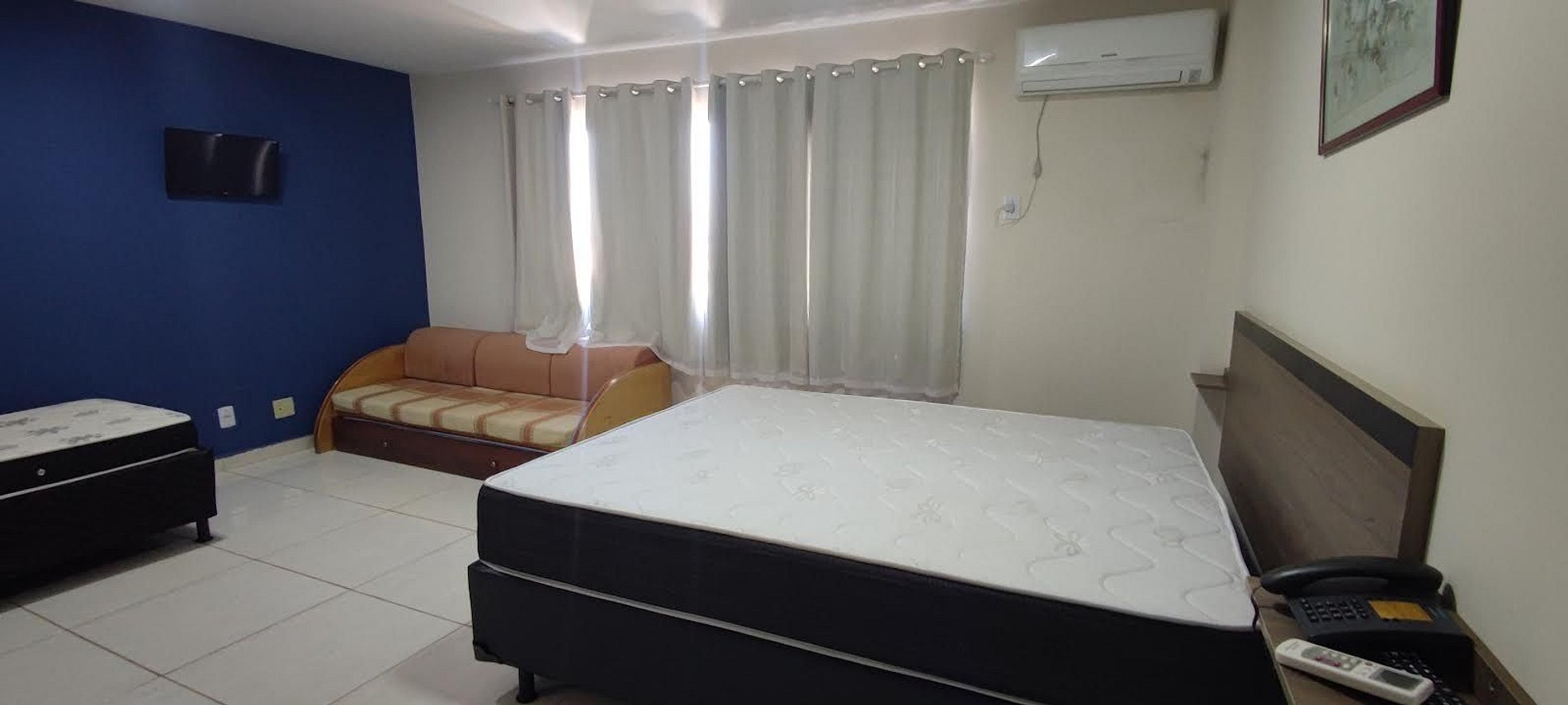 -suite com cama de casal com ar condicionado, cama de solteiro e sofá cama, TV.