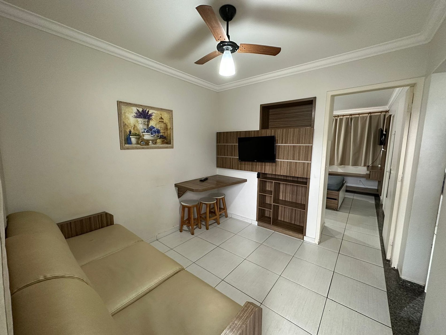 Sala com sofá cama de casal, Tv. Cozinha com geladeira, fogão e microondas, utensílios básicos de cozinha.