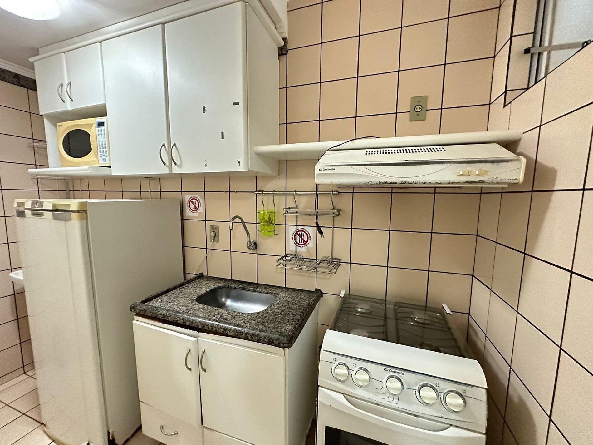 Sala com sofá cama de casal, Tv. Cozinha com geladeira, fogão e microondas, utensílios básicos de cozinha.