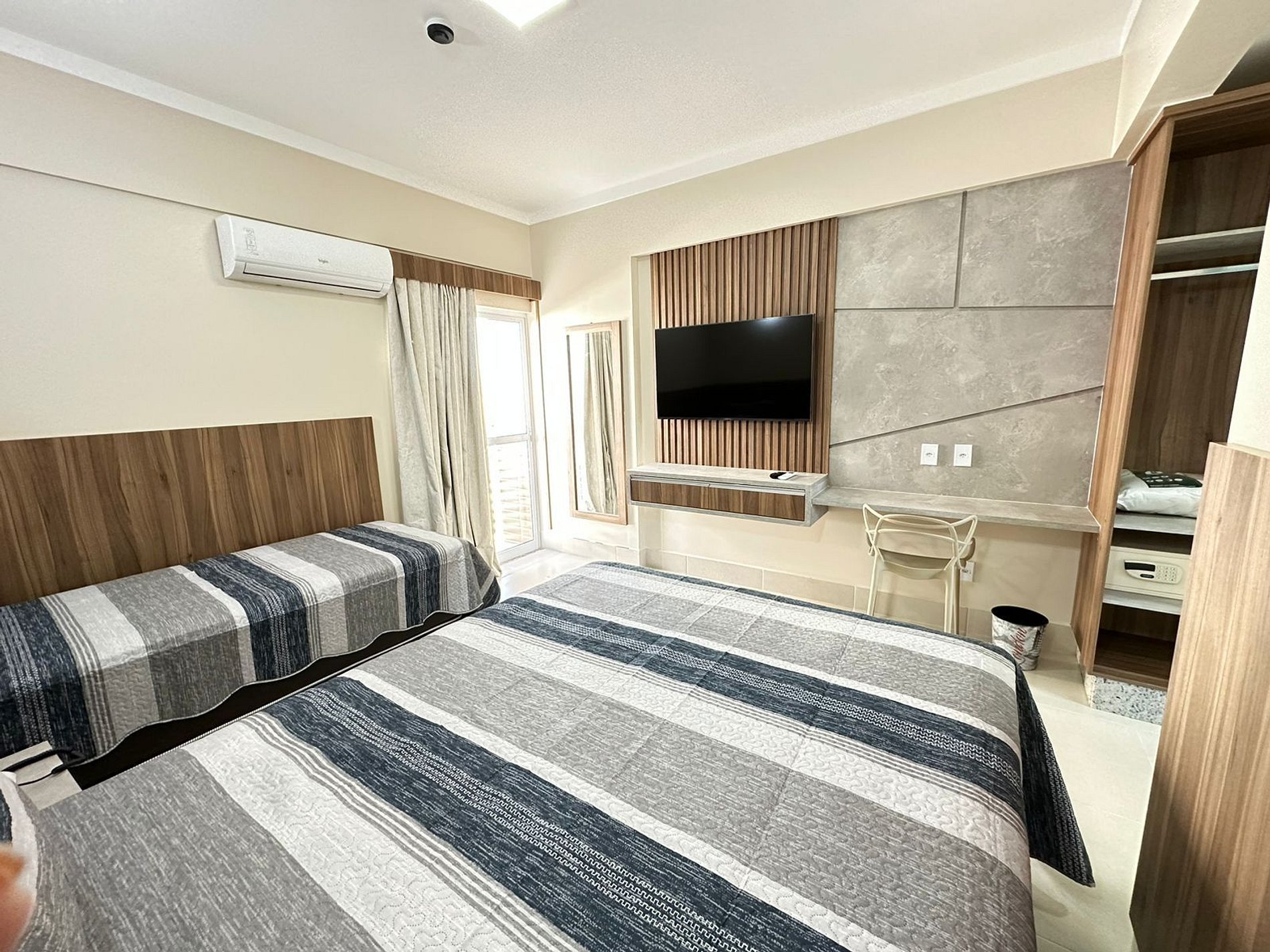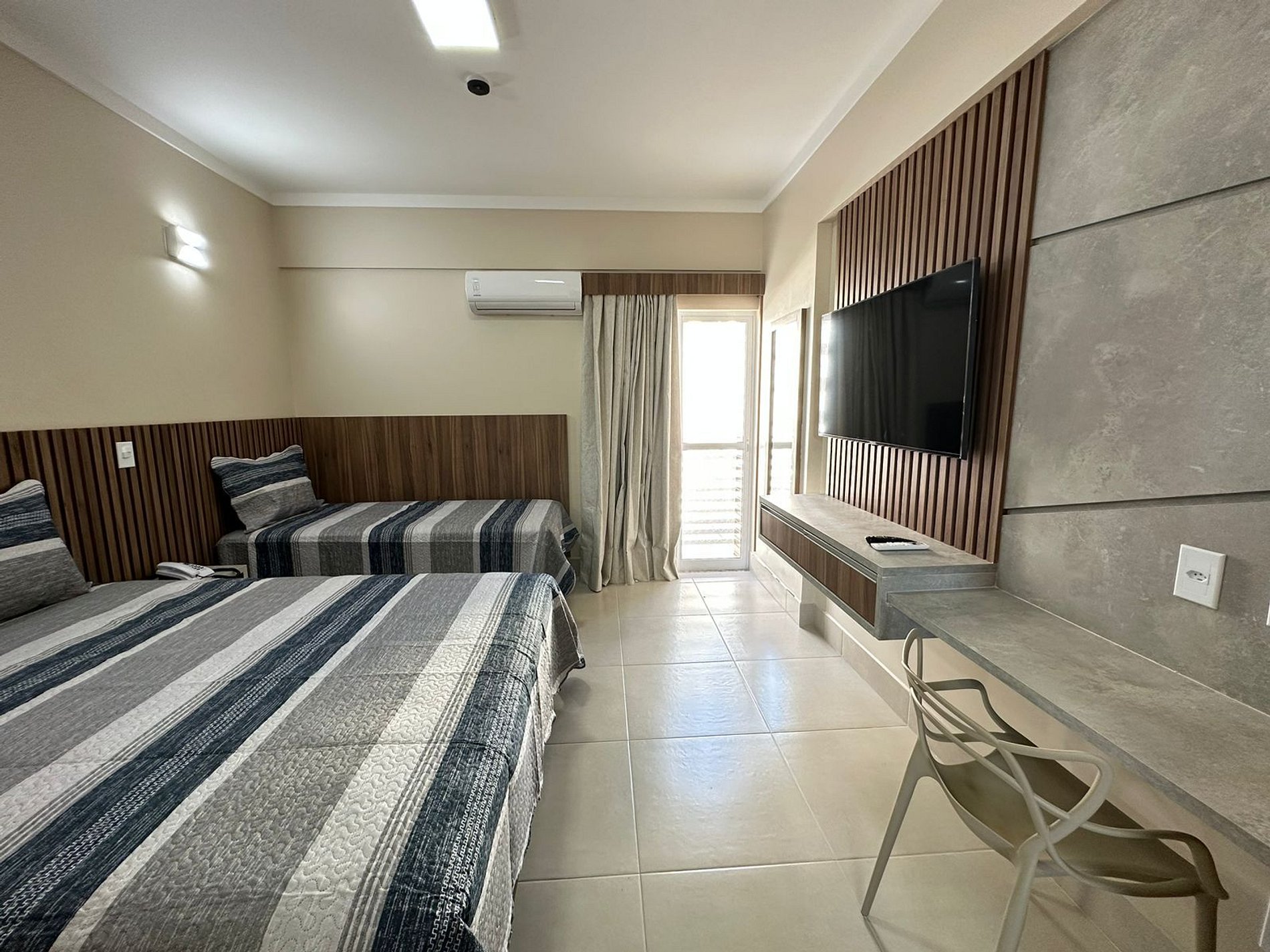 Suite com cama de casal, cama de solteiro com auxiliar, ar condicionado, TV a cabo, geladeira e microondas. Capacidade de acomodação para até 4 pessoas independente da idade. A hospedagem não está incluso roupas de cama e nem alimentação.
