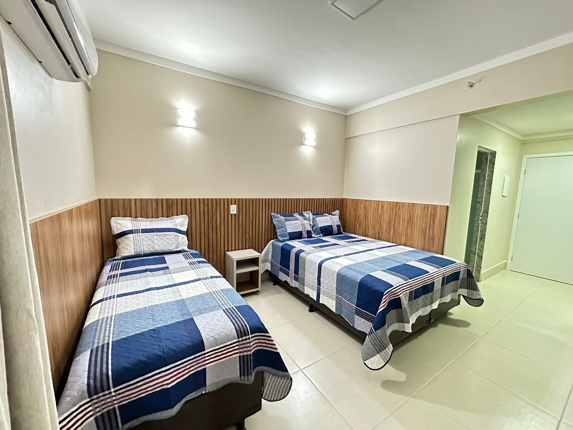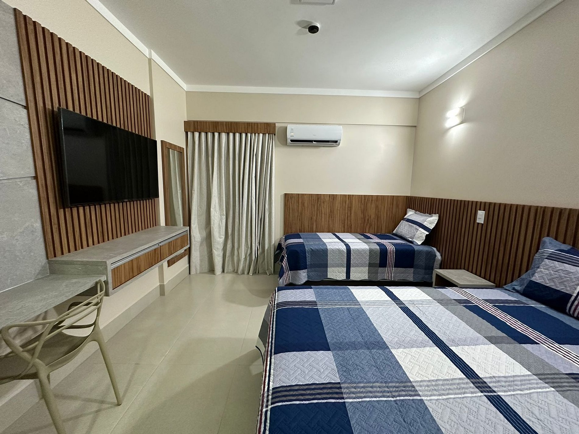 Suite com cama de casal, cama de solteiro com auxiliar, ar condicionado, TV a cabo, geladeira e microondas.