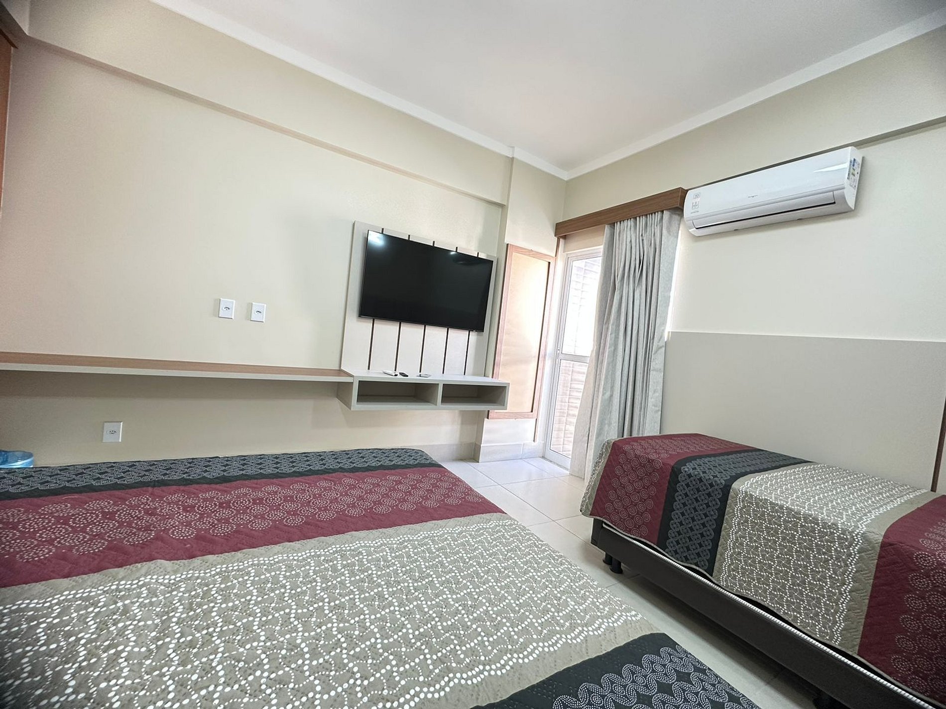Suite com cama de casal, cama de solteiro com auxiliar, ar condicionado, TV a cabo, geladeira.