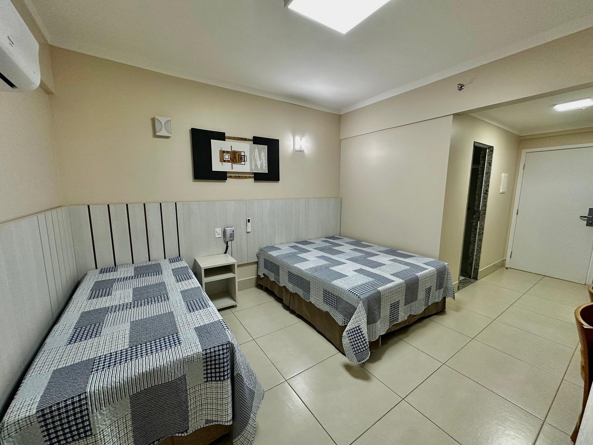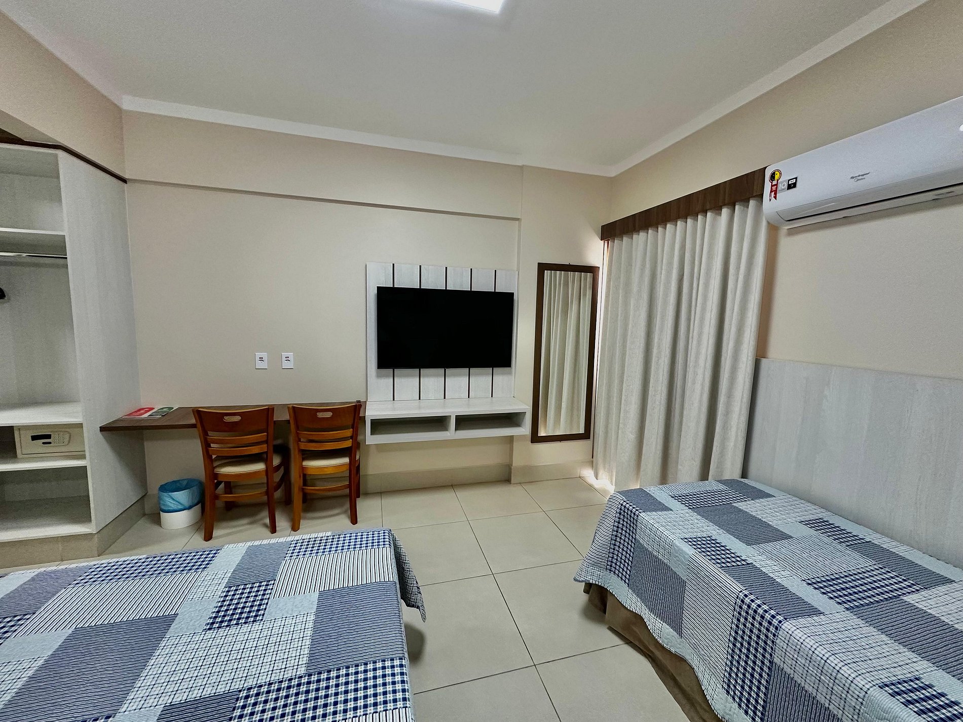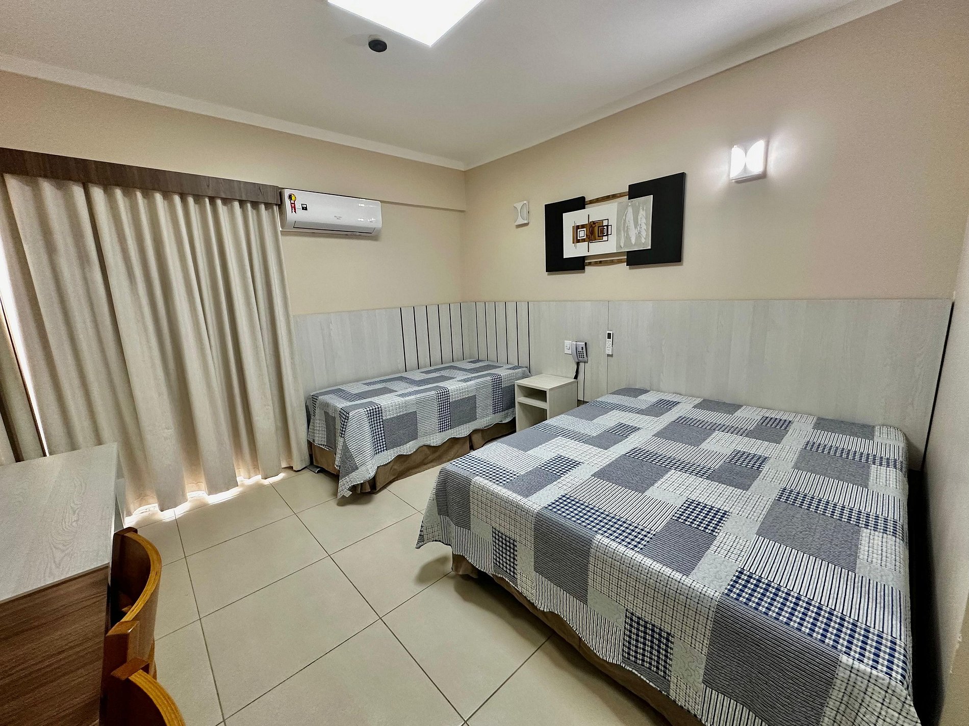 Suite com cama de casal, cama de solteiro com auxiliar, ar condicionado, TV a cabo, geladeira.