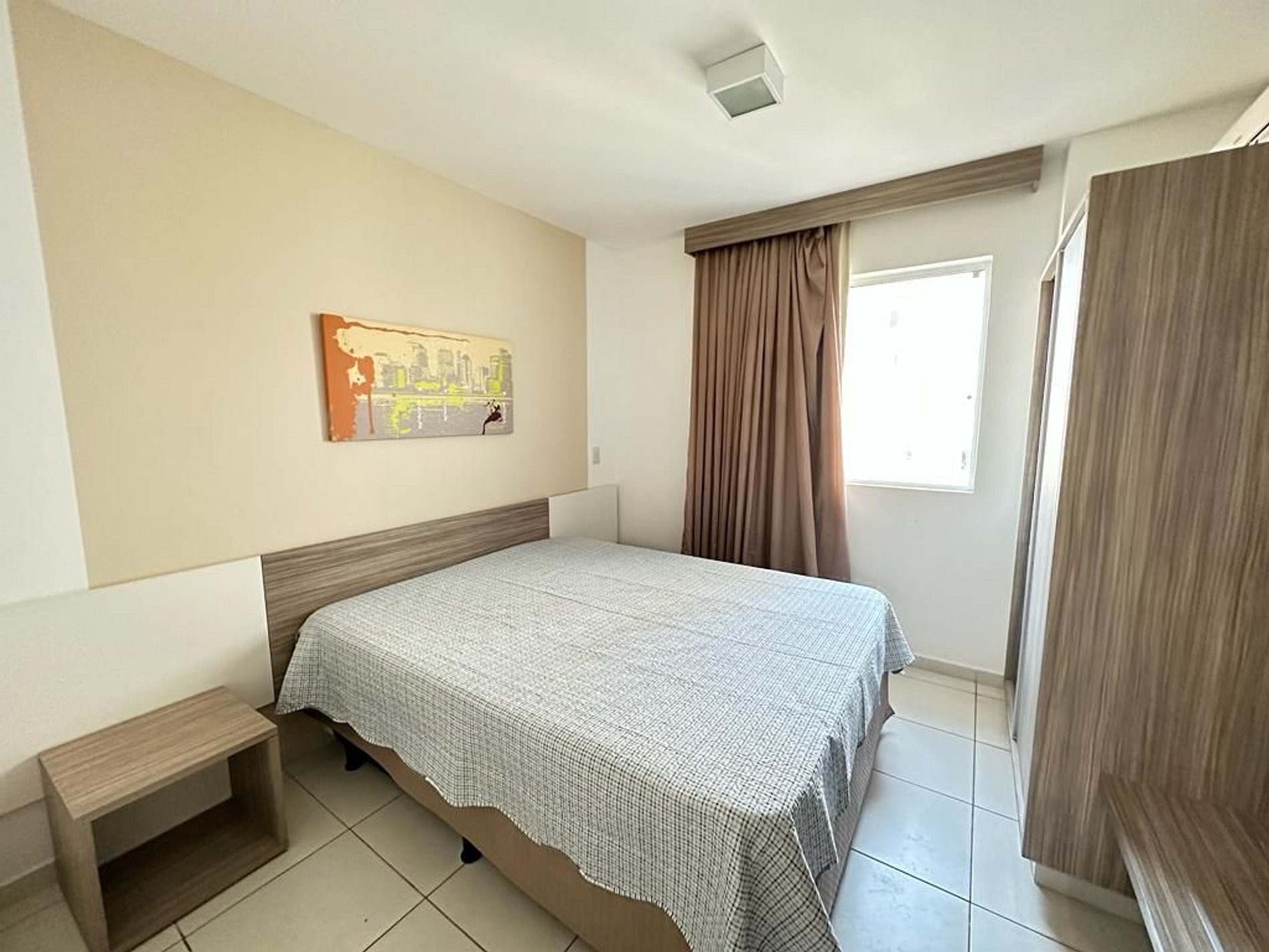 Apartamento de 1 quarto contendo suíte de casal com ar condicionado, sala com sofá cama de casal, TV, Frigobar, microondas e fogão.
