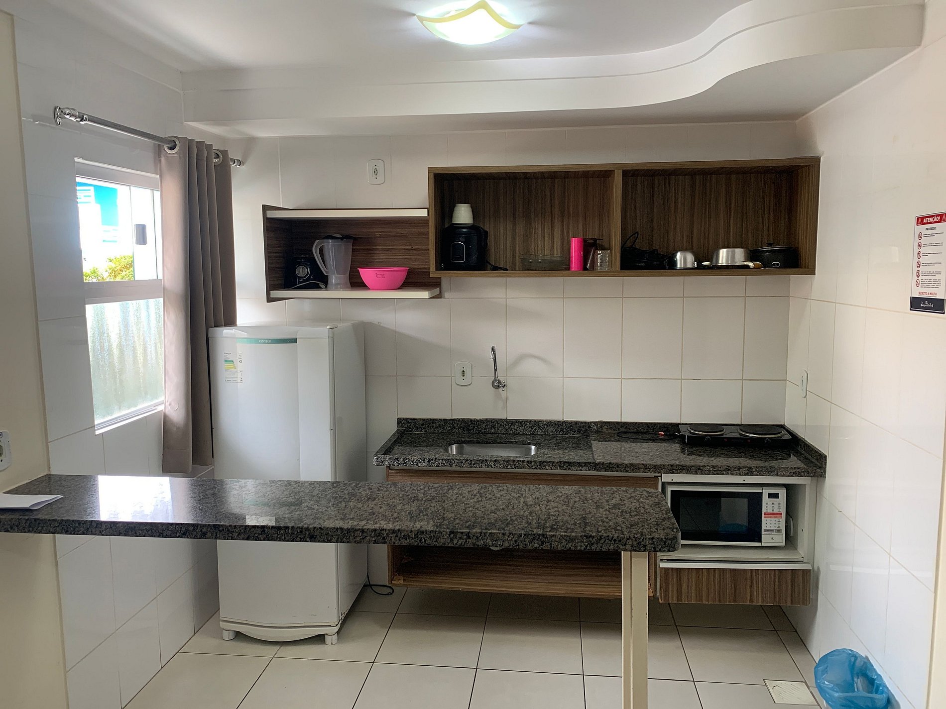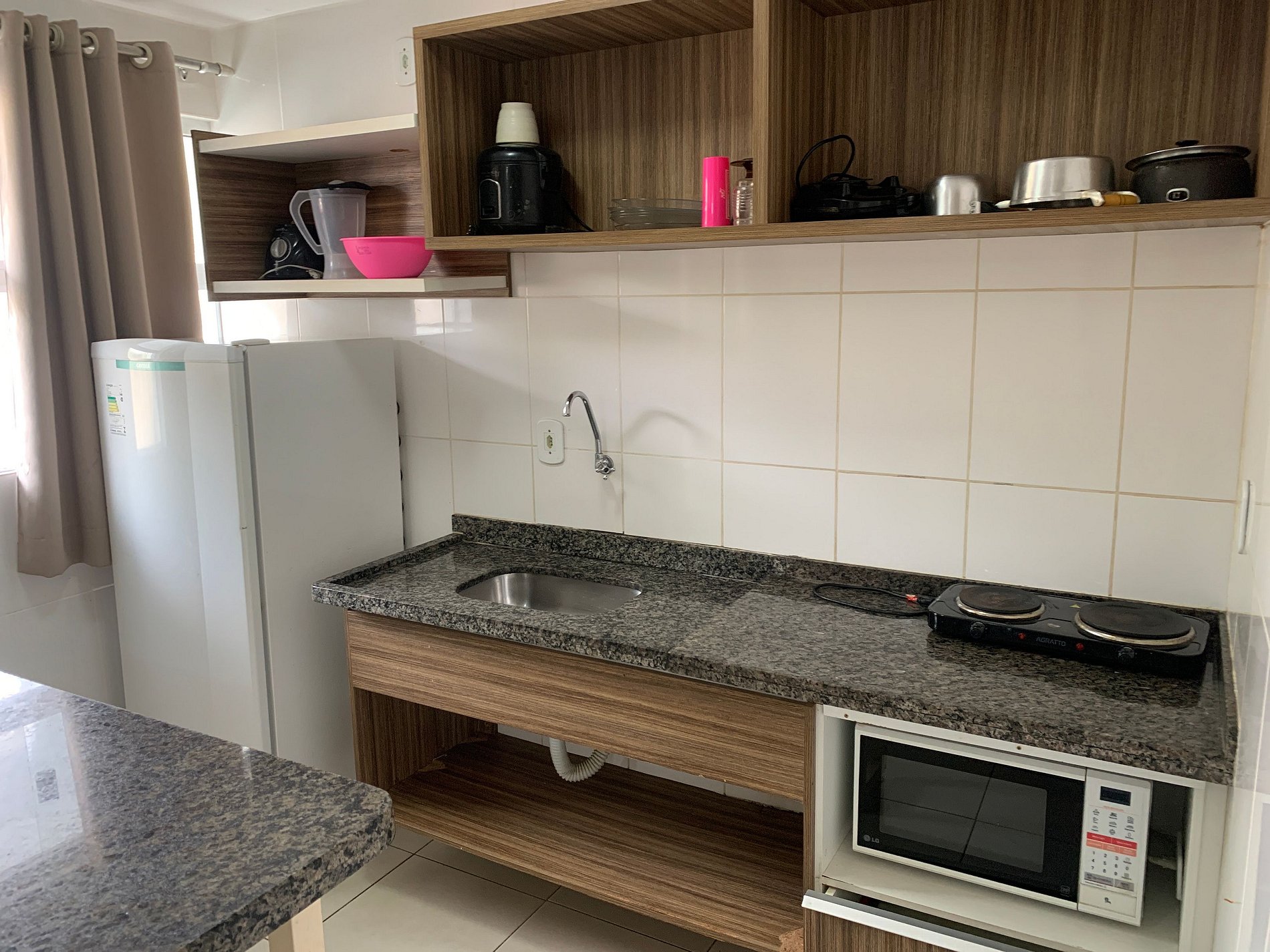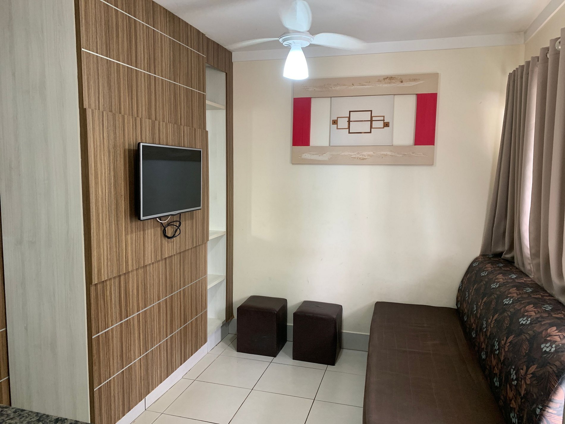 Flats contendo suíte de casal com TV e ar condicionado, colchão extra de solteiro . Sala com sofá cama de casal, TV. Cozinha compacta com geladeira, fogão elétrico, microondas, panela elétrica e utensílios básicos.