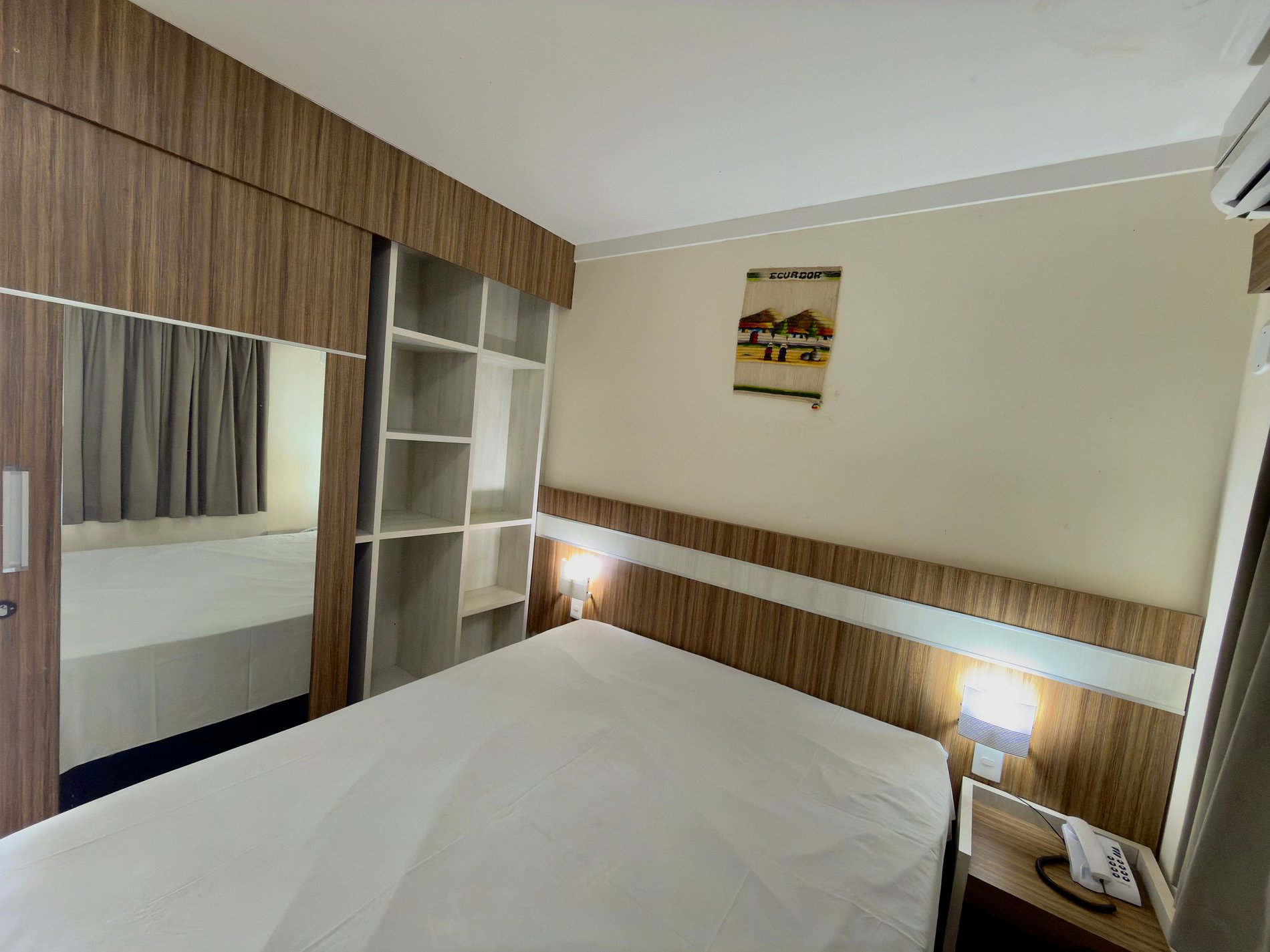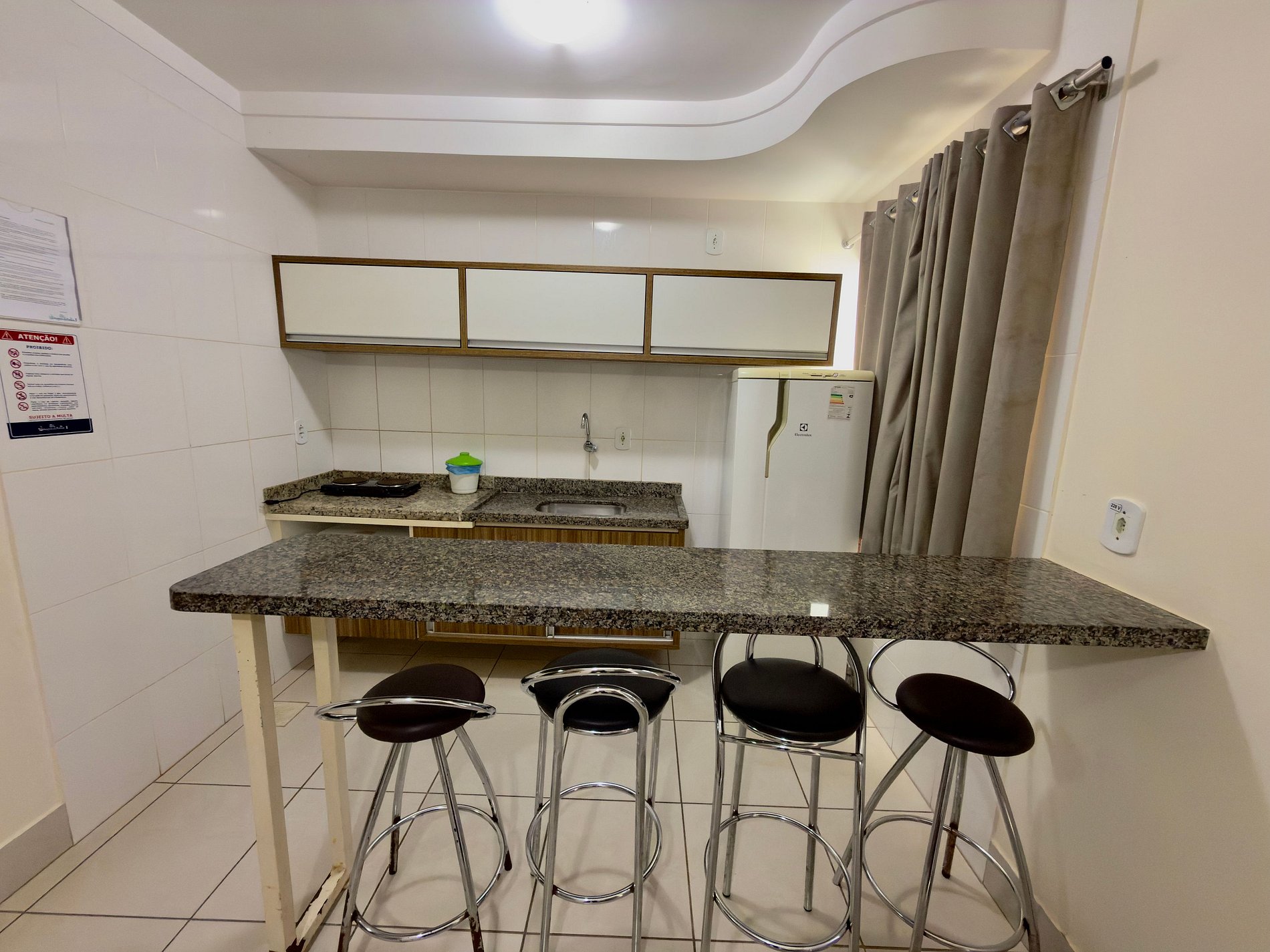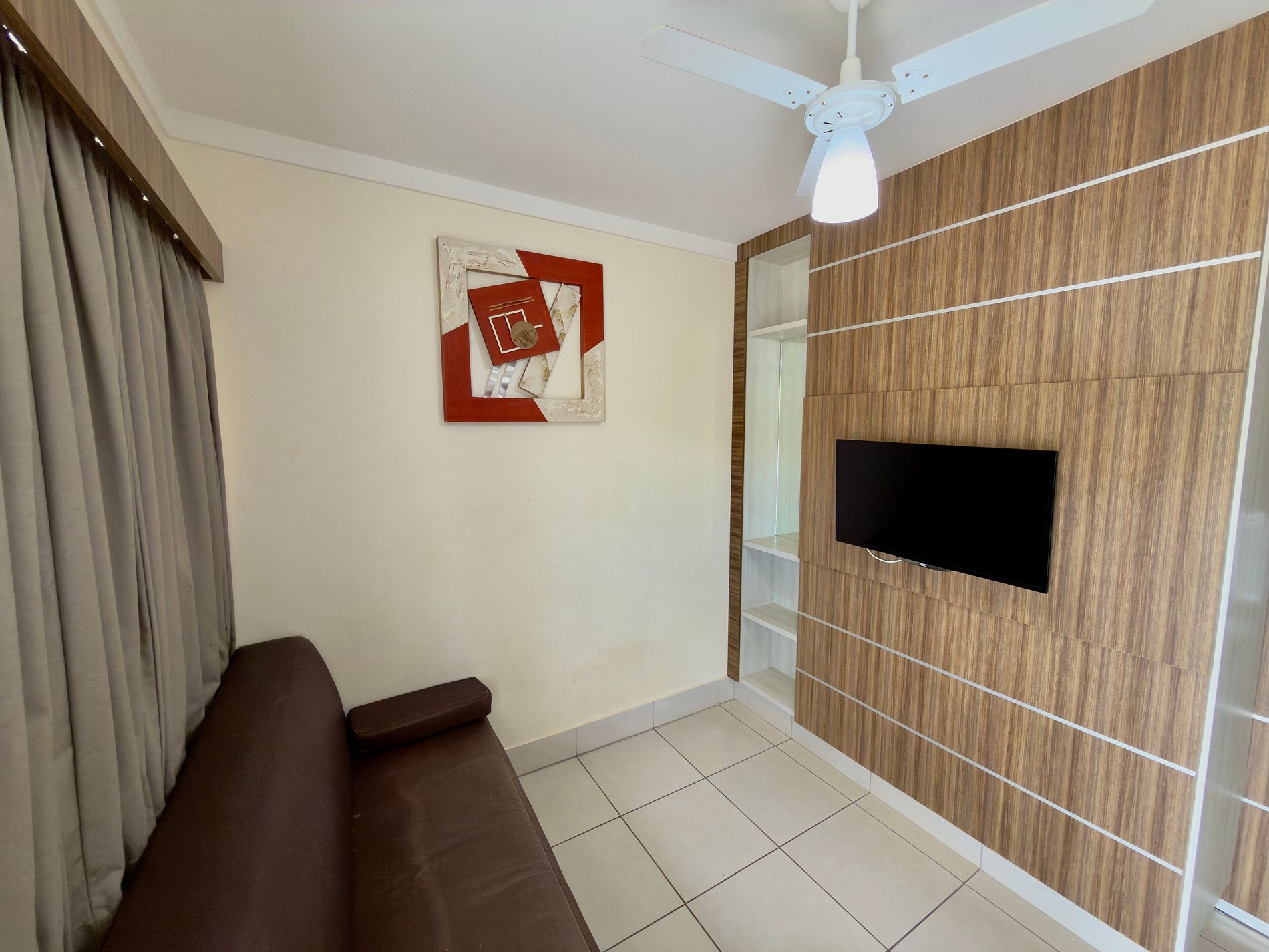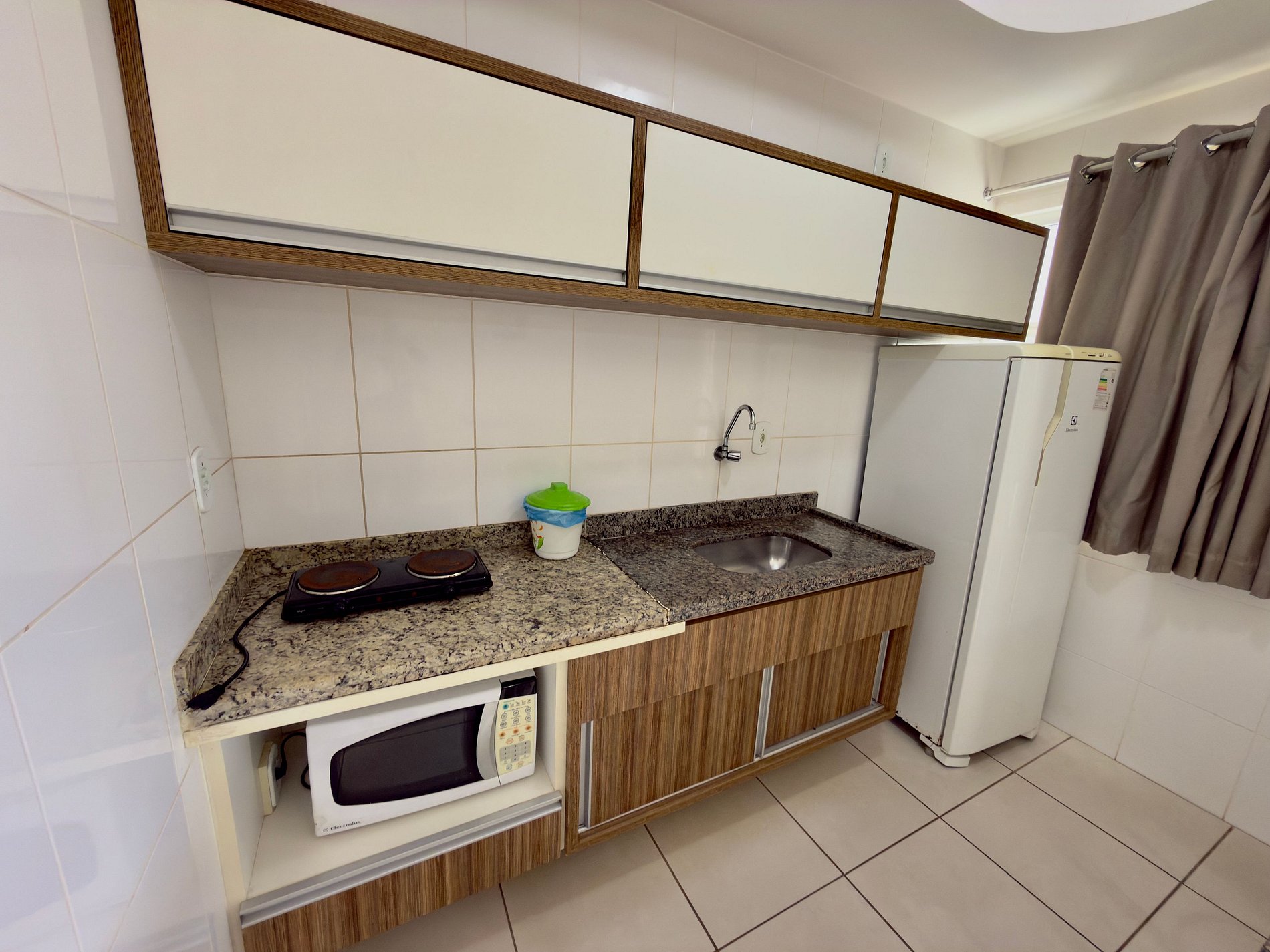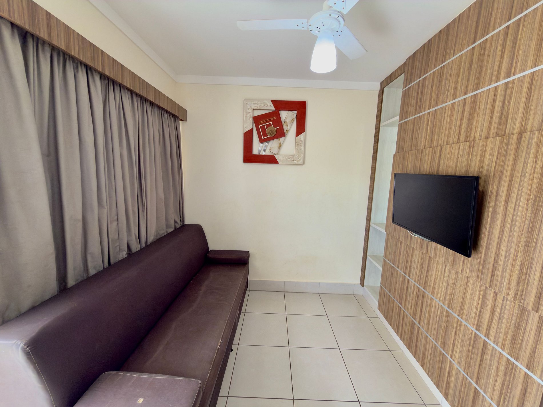 Flats contendo suíte de casal com TV e ar condicionado. Sala com sofá cama de casal, TV, ventilador de teto. Cozinha compacta com geladeira, microondas, fogão elétrico.