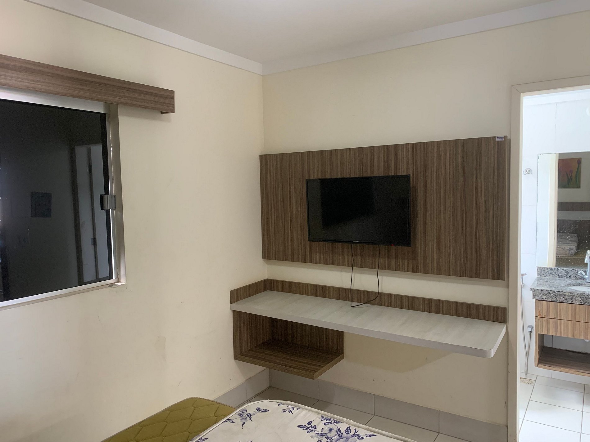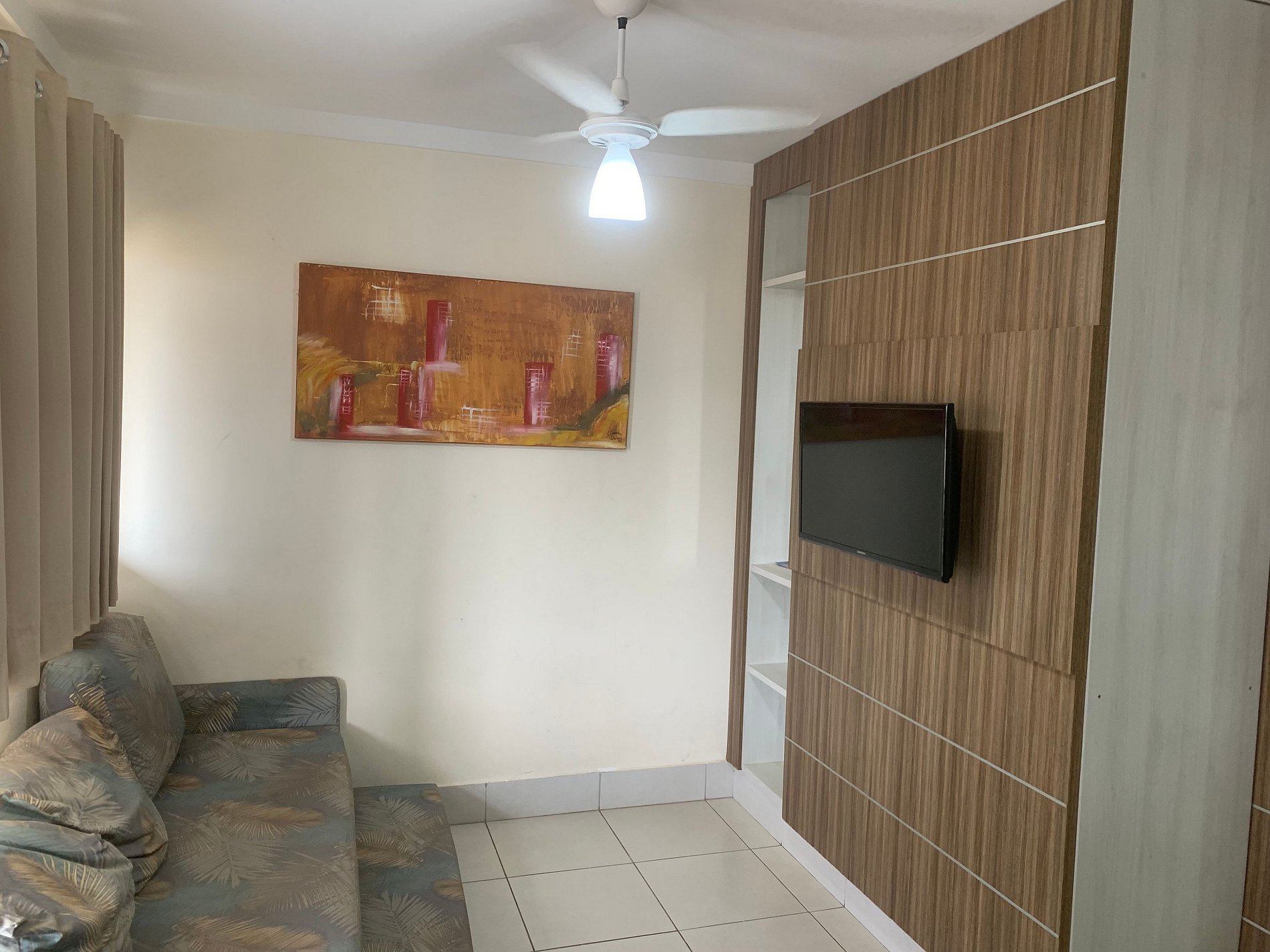 Flats contendo suíte de casal com TV e ar condicionado, colchão extra de solteiro. Sala com sofá cama de casal, TV, ventilador de teto. Cozinha compacta com geleira, microondas, fogão elétrico e utensílios básicos.