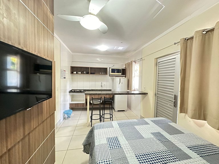 Flats contendo suíte de casal com TV e ar condicionado. Sala com sofá cama de casal, TV. Acomoda até 5 pessoas independente da idade.