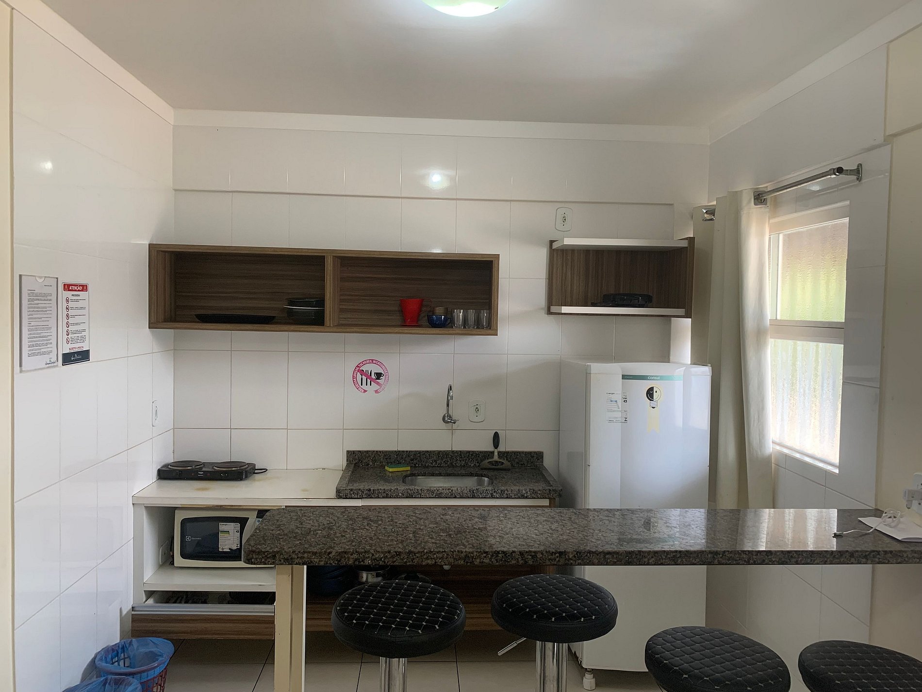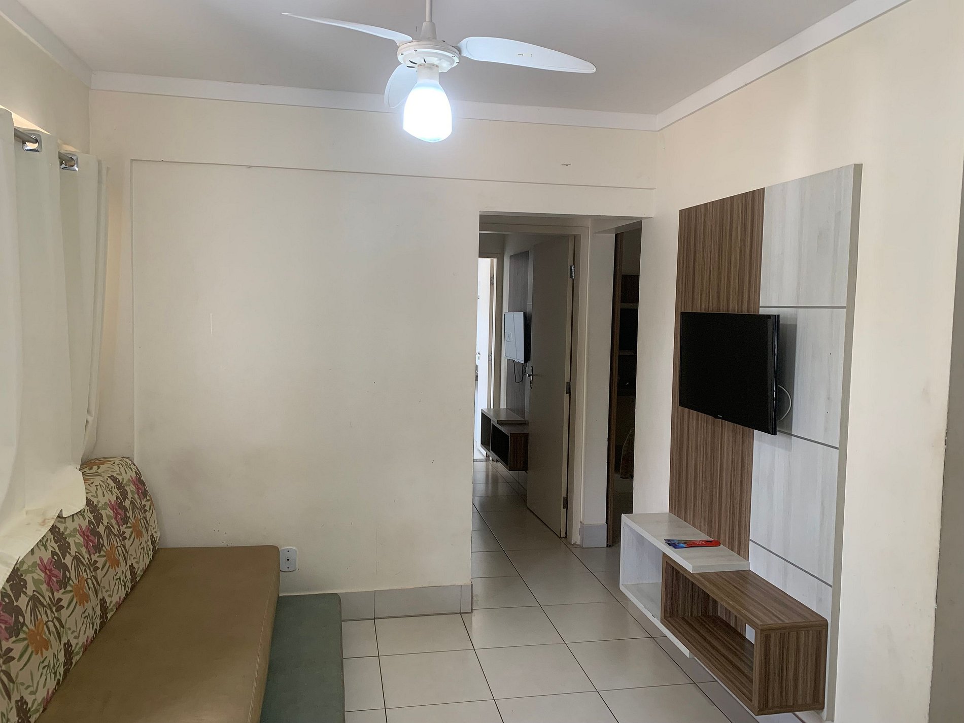 Sala com sofá cama de casal, TV, ventilador de teto. Cozinha compacta com geladeira, microondas, fogão elétrico e utensílios básicos.