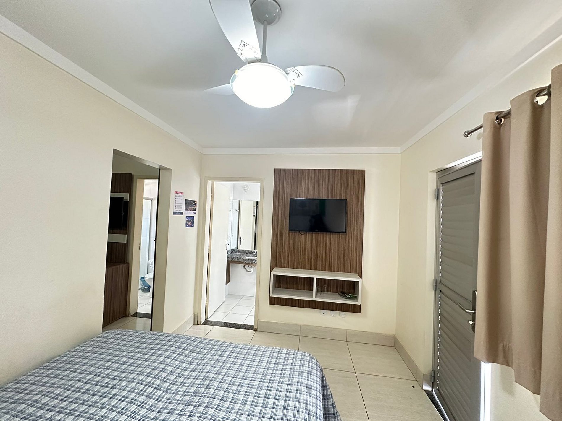 Sala com cama de casal, TV e ventilador de teto