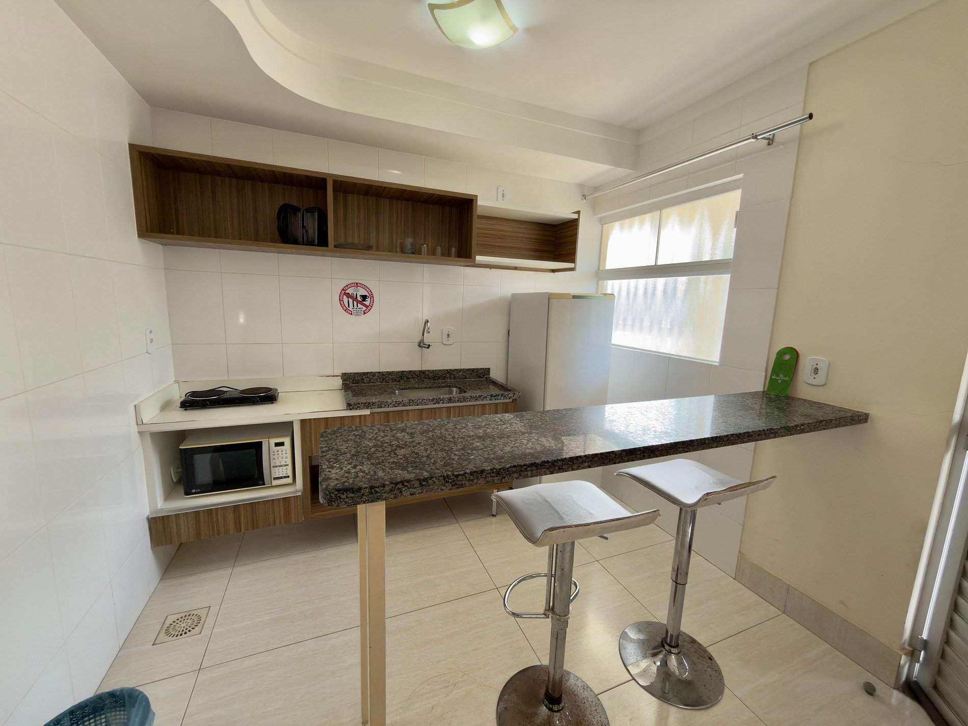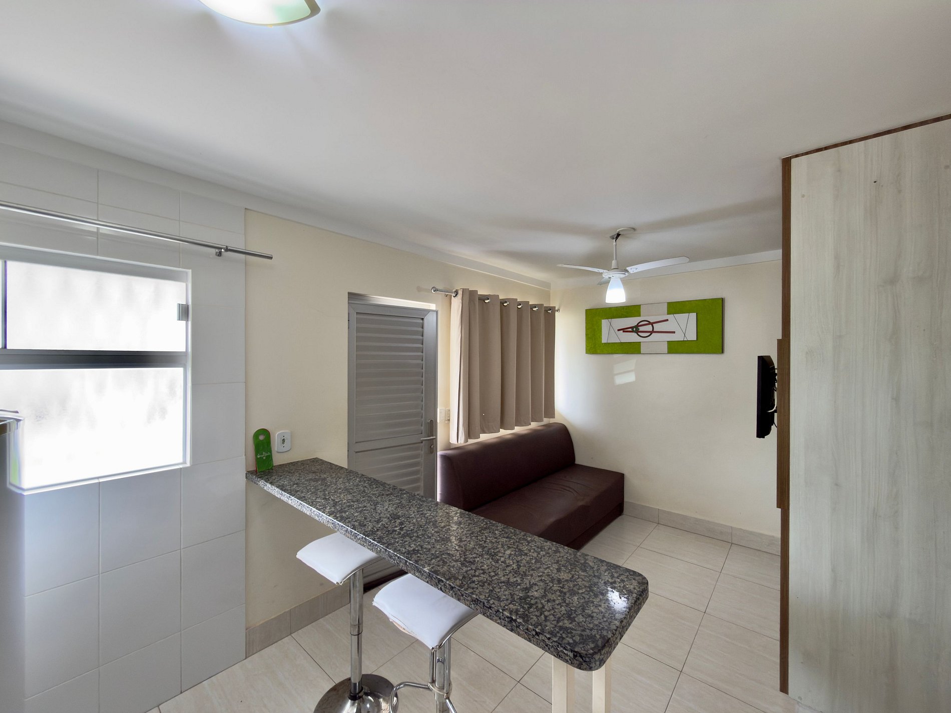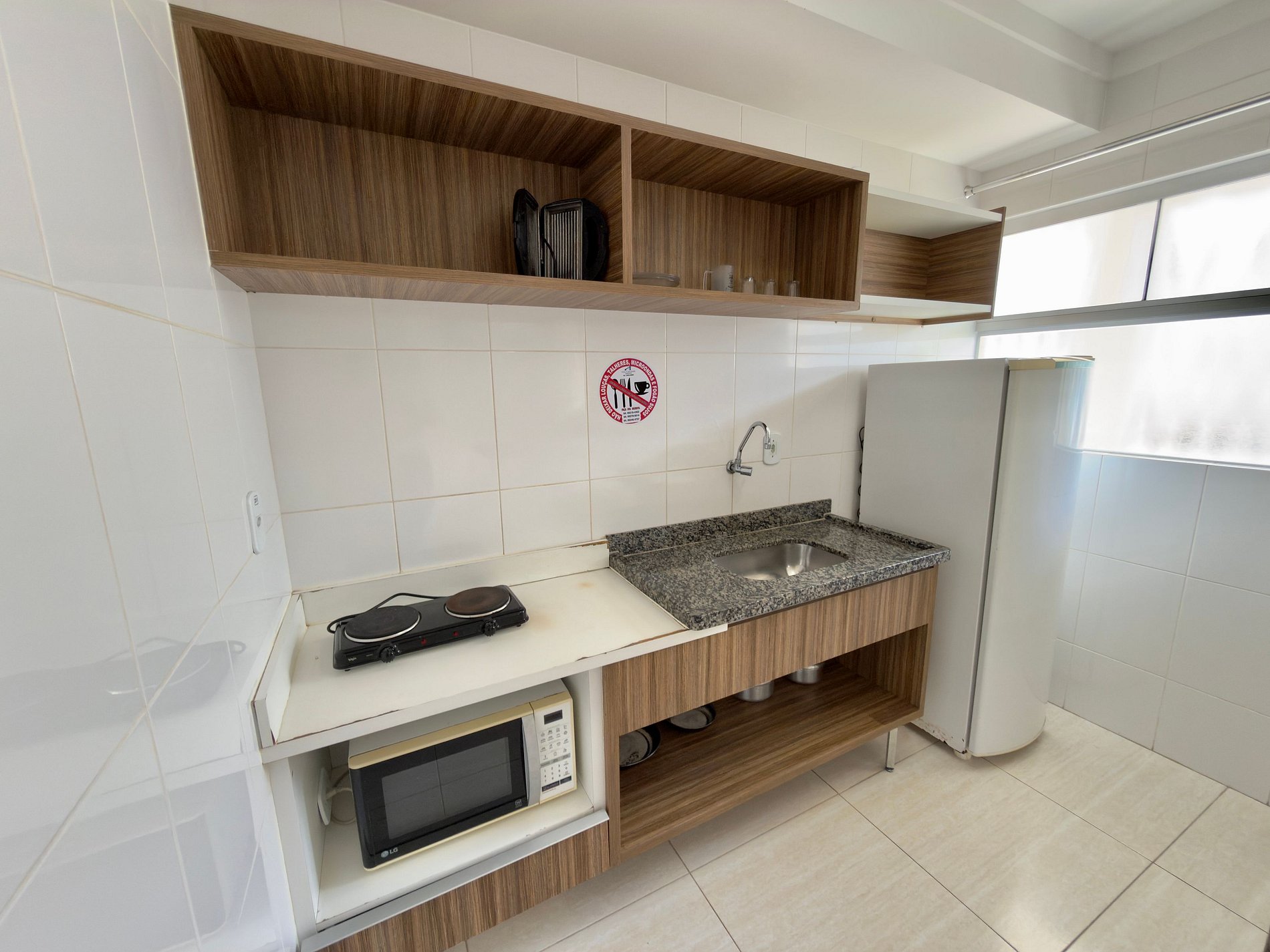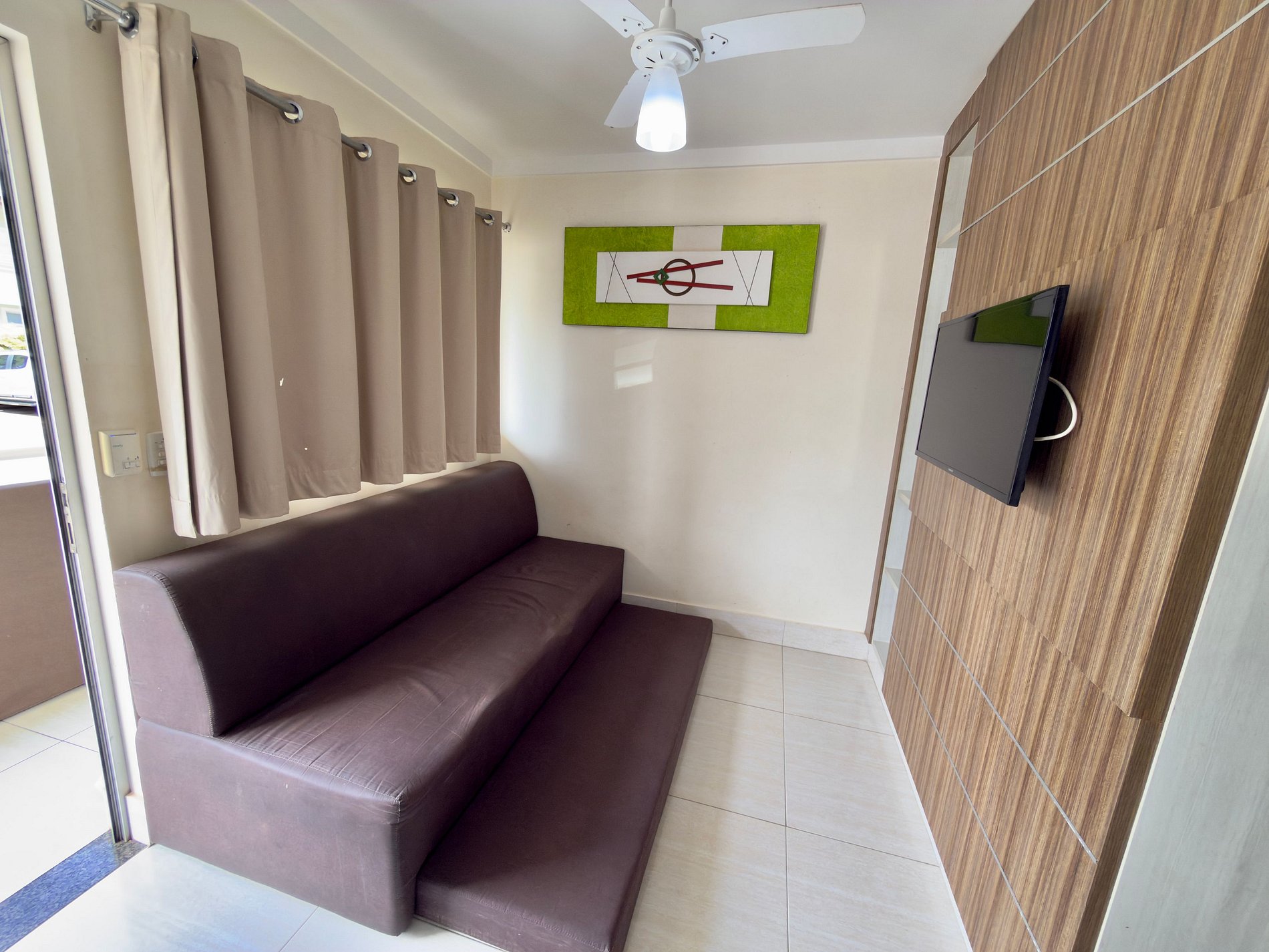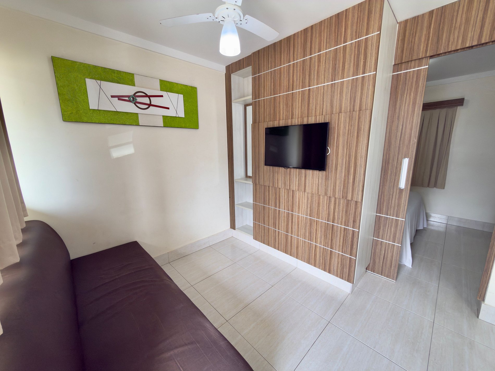 Sala com sofá cama de casal, TV. Cozinha compacta com geladeira, microondas, fogão elétrico e utensílios básicos.
