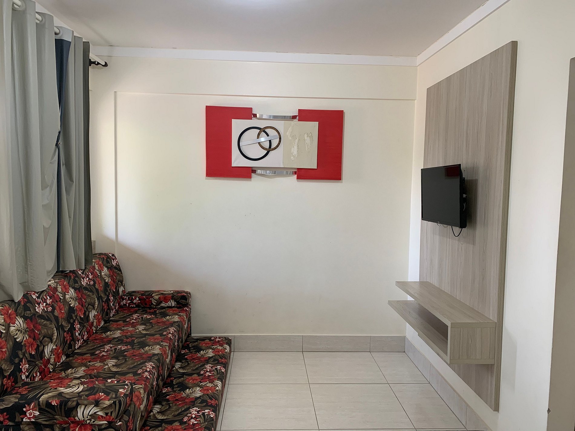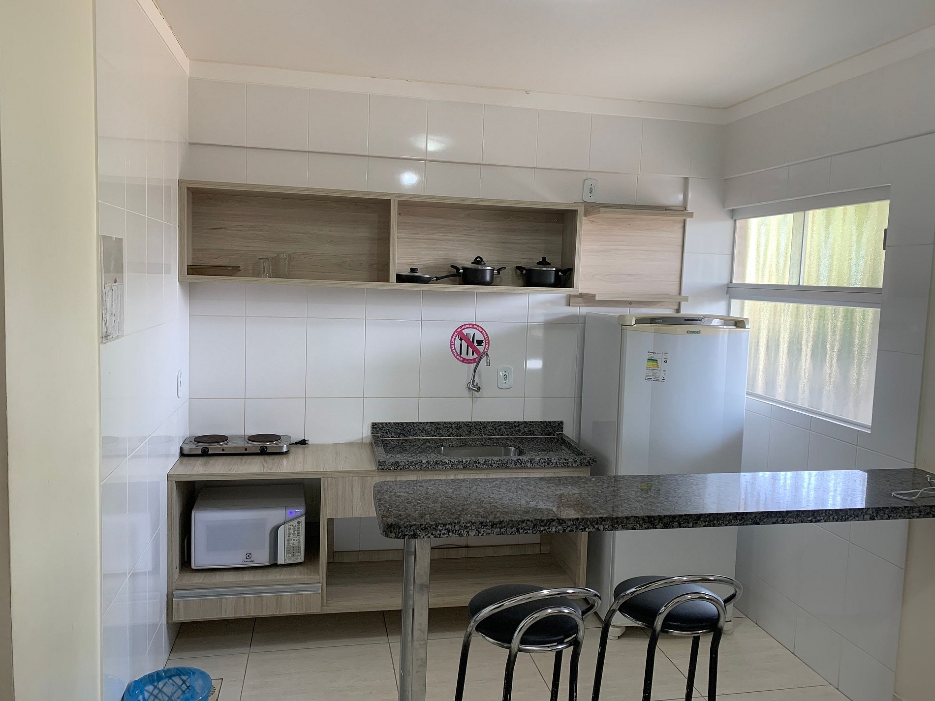 Sala com sofá cama de casal, TV. Cozinha compacta com geladeira, microondas fogão elétrico e utensílios básicos.