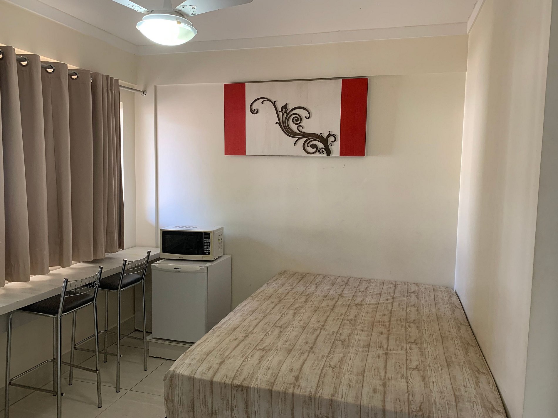 Sala com cama de casal, TV, frigobar e microondas, banheiro social. (Flat sem cozinha).