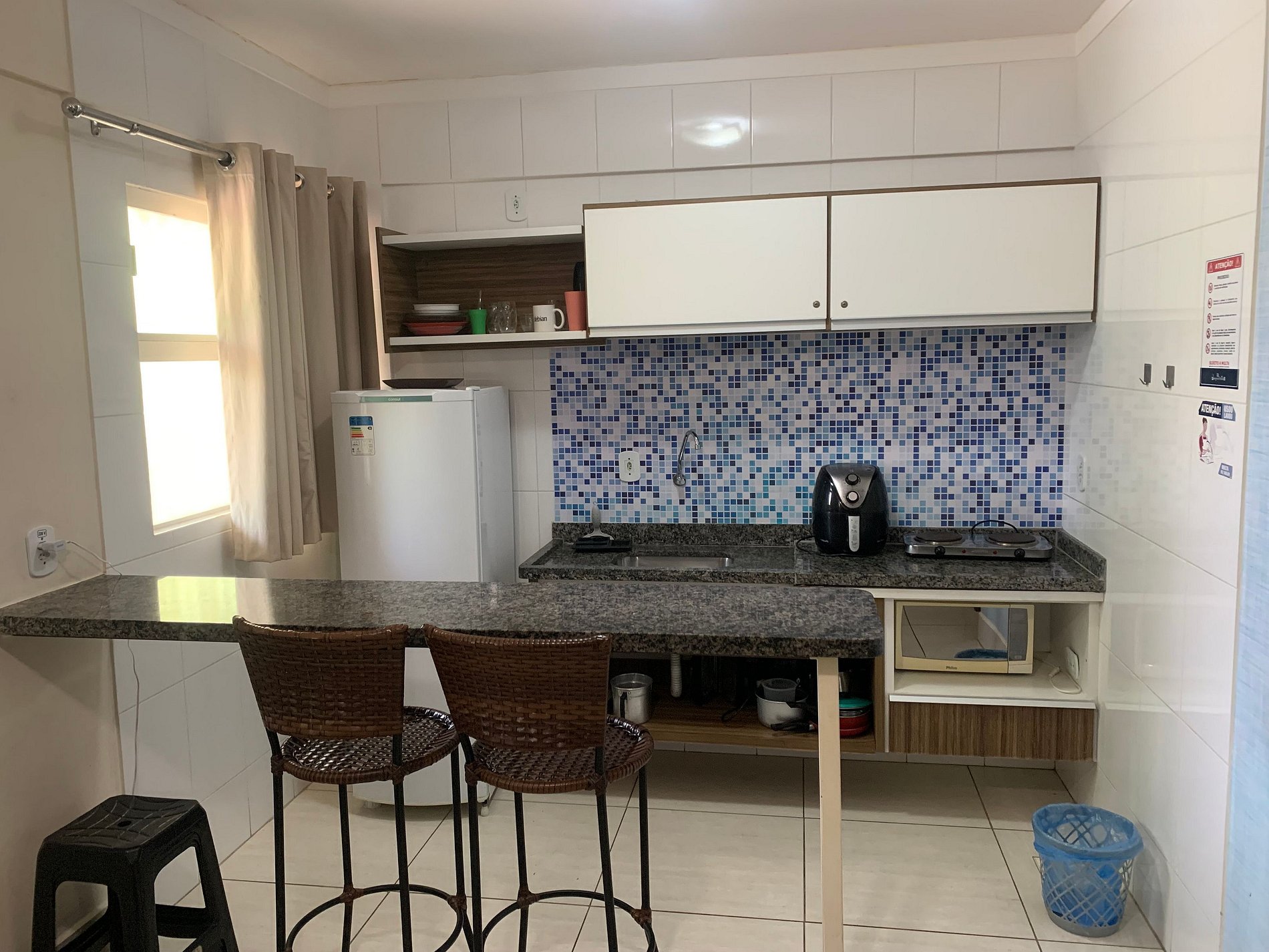 Sala com sofá cama de casal, TV. Cozinha compacta com geladeira, microondas, panela elétrica, fogão elétrico, sanduicheira e utensílios básicos.