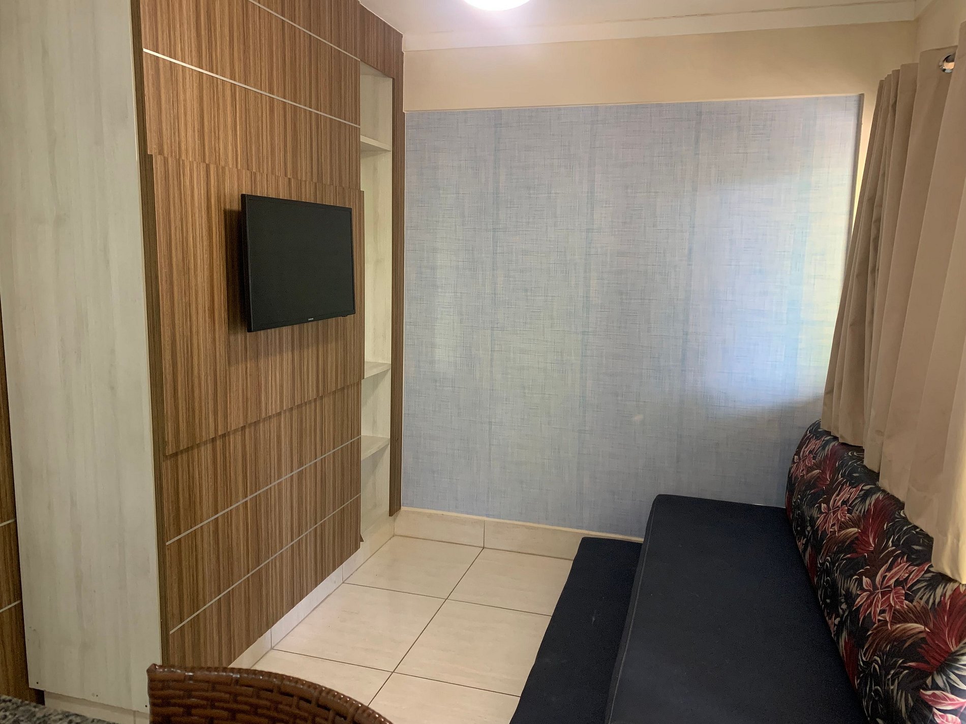 Sala com sofá cama de casal, TV. Cozinha compacta com geladeira, microondas, panela elétrica, fogão elétrico, sanduicheira e utensílios básicos.