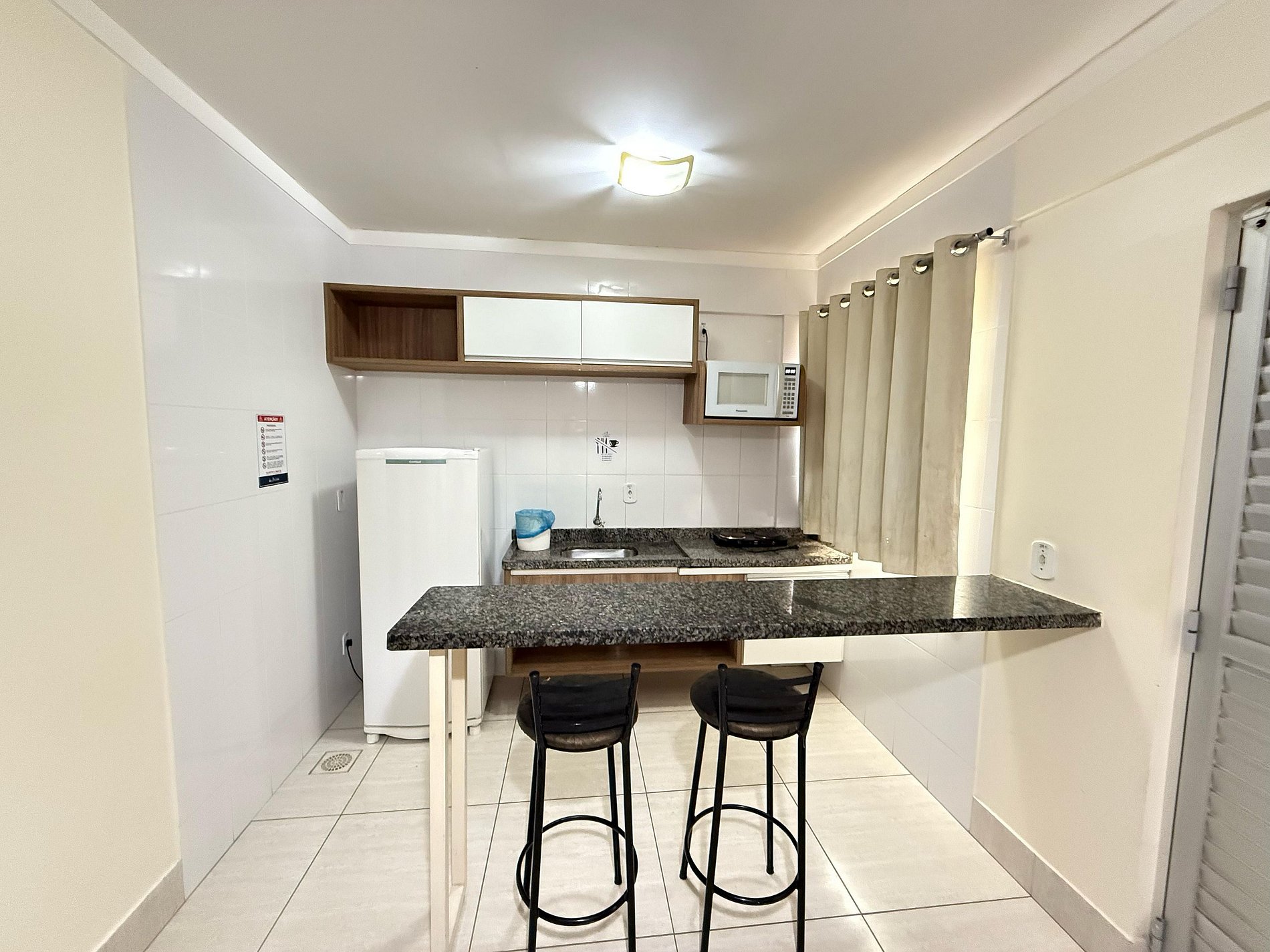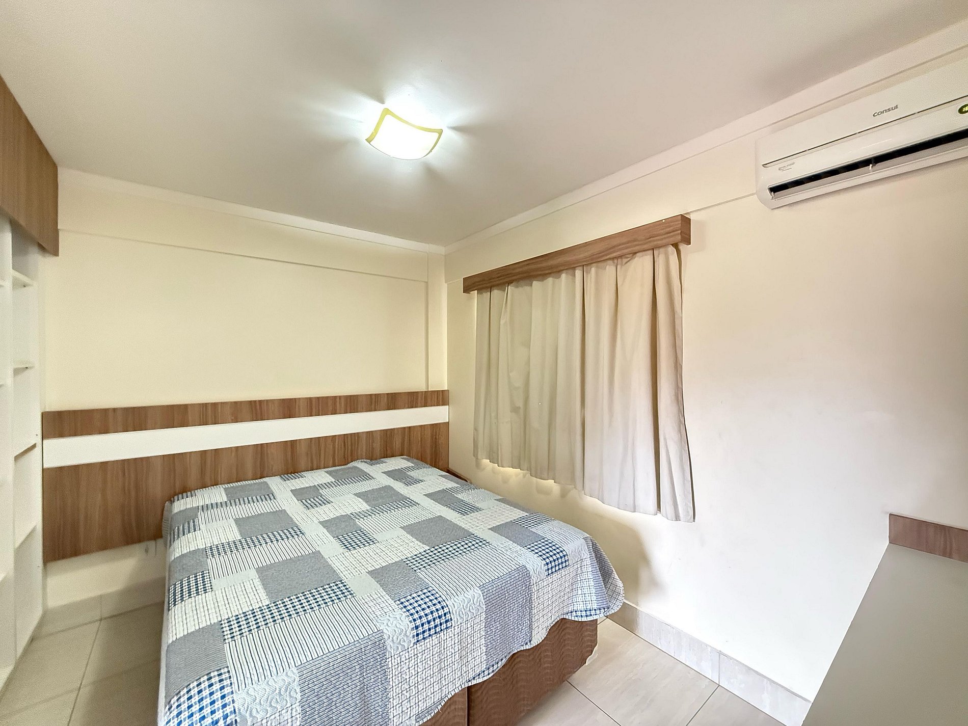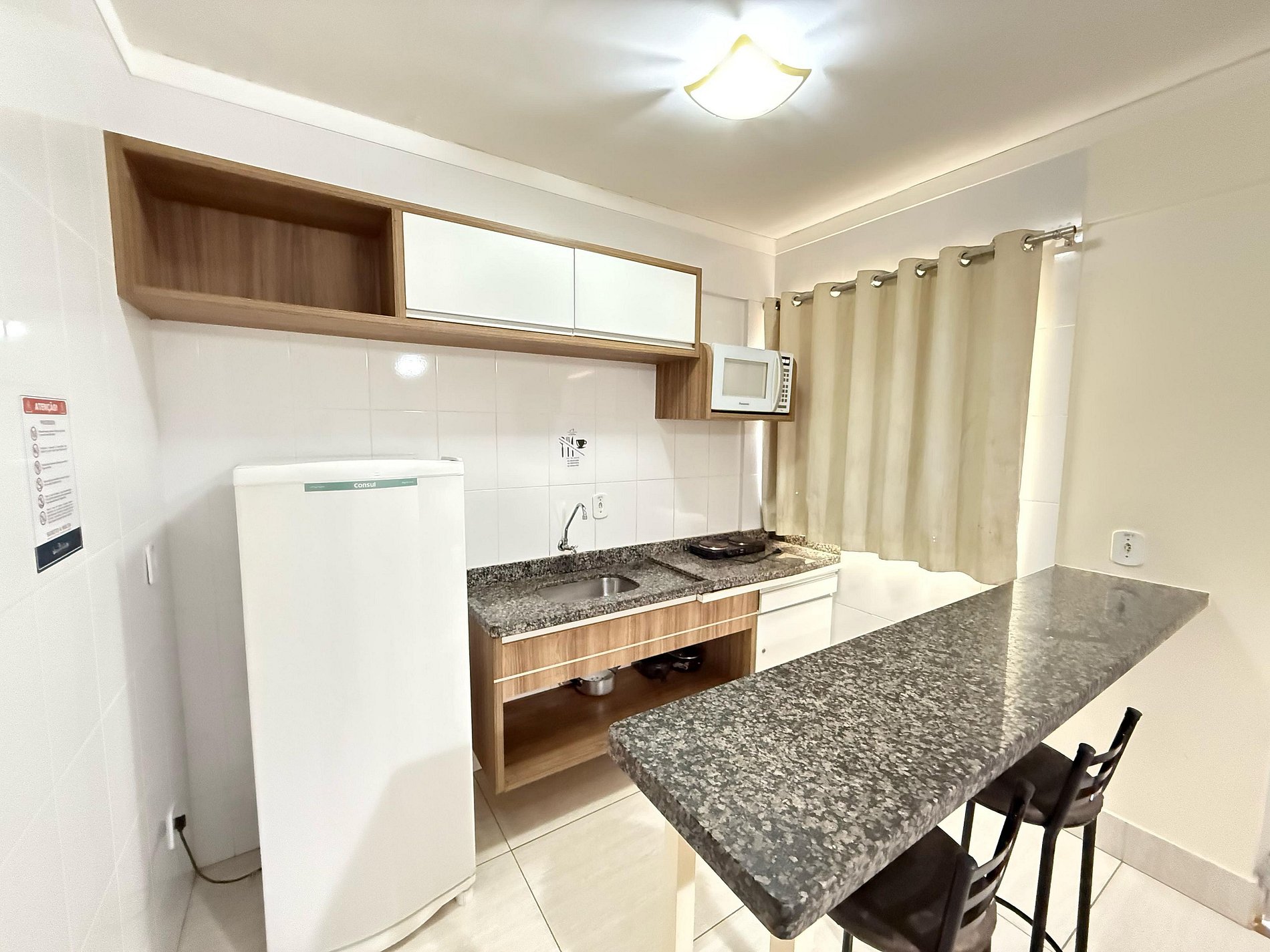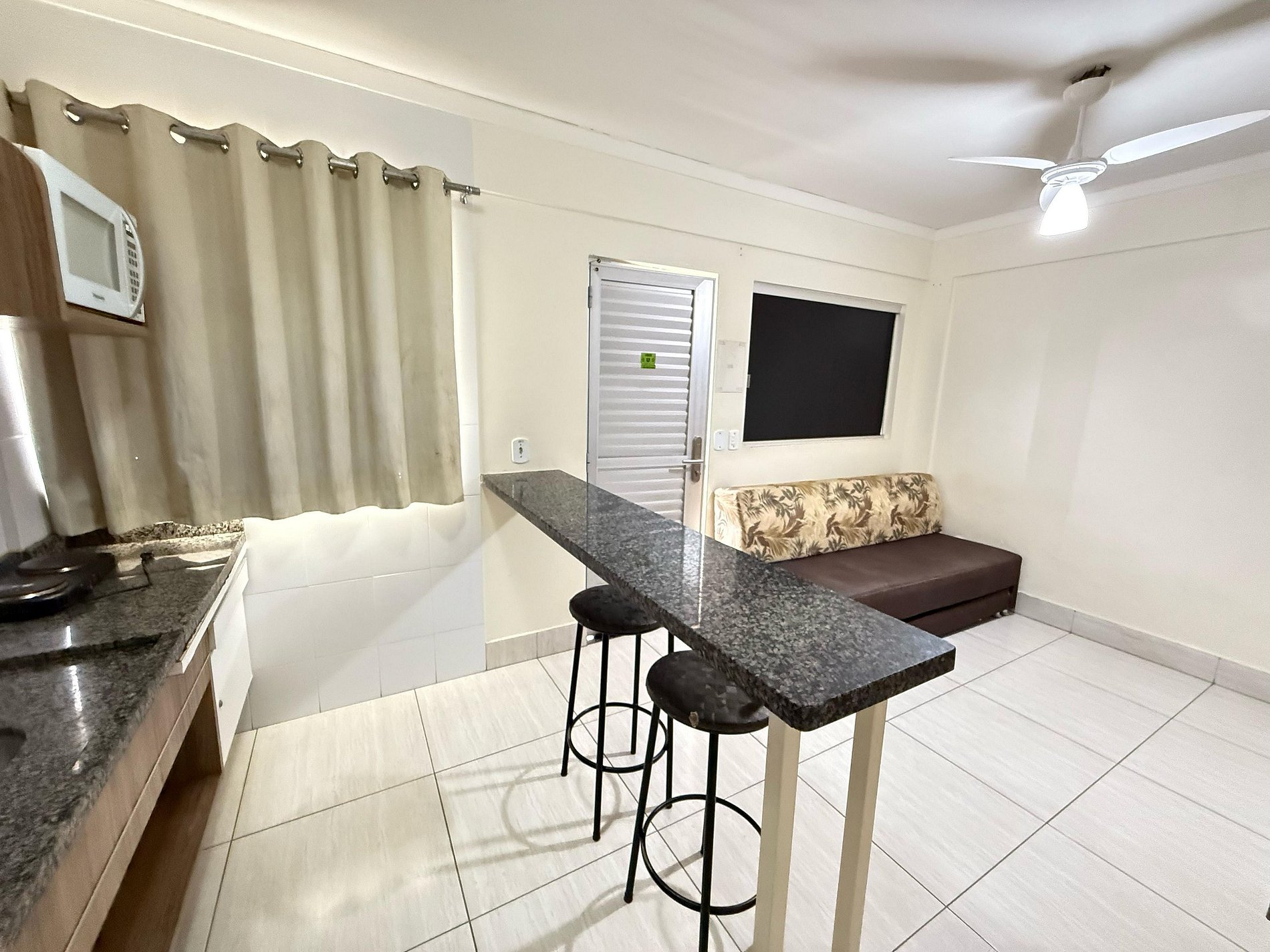 Suíte equipada com cama de casal, ar-condicionado e TV a cabo. Sala com sofá-cama, TV a cabo e ventilador de teto. Cozinha compacta com geladeira e micro-ondas. Acomoda até 5 pessoas, independente da idade. A hospedagem não inclui roupas de cama, banho ou piso, nem alimentação.