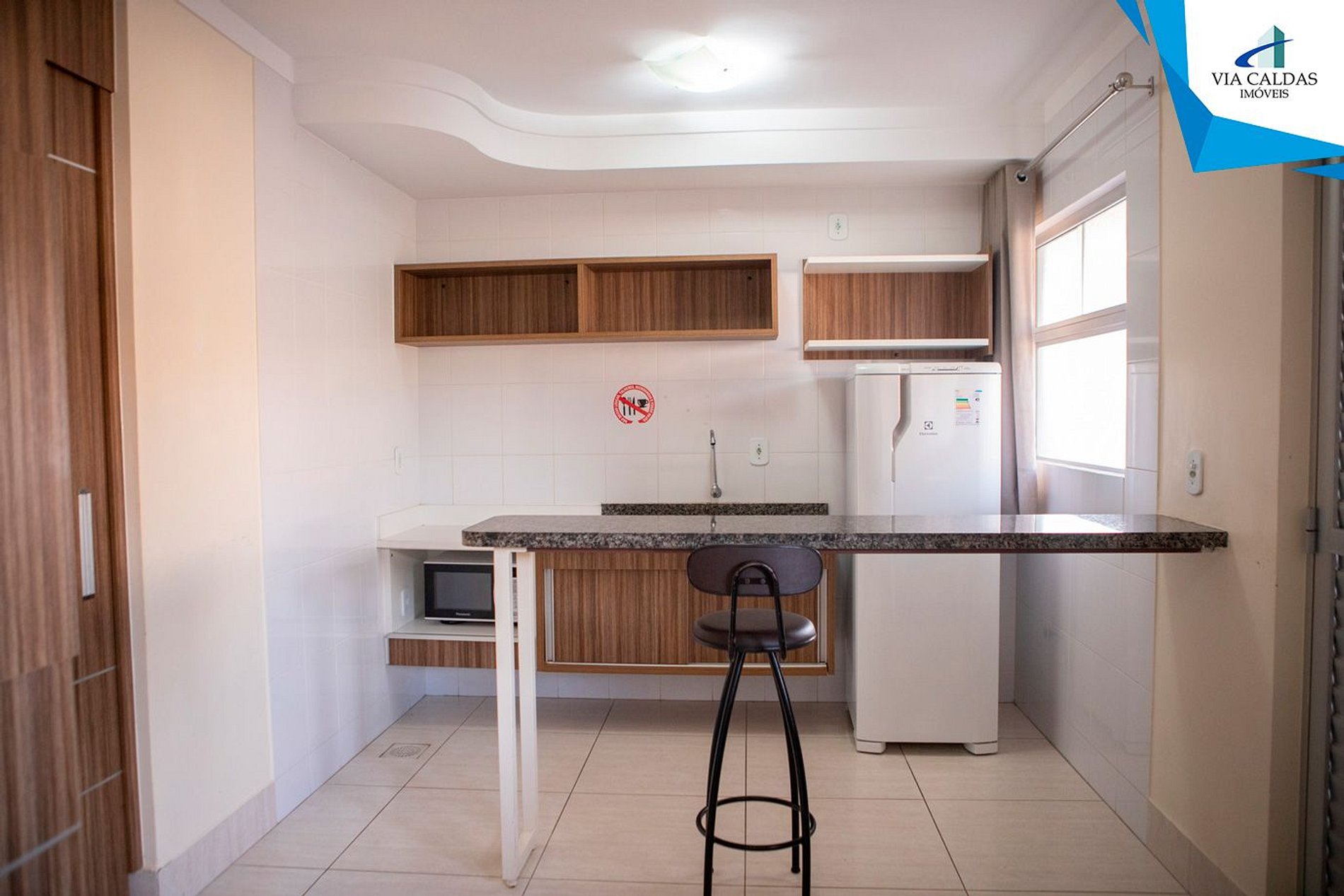 com sofá cama de casal, TV, ventilador de teto. Cozinha compacta com geladeira/frigobar e microondas.