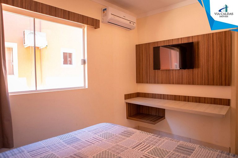 Apartamento contendo suite de casal com TV e ar condicionado, sala