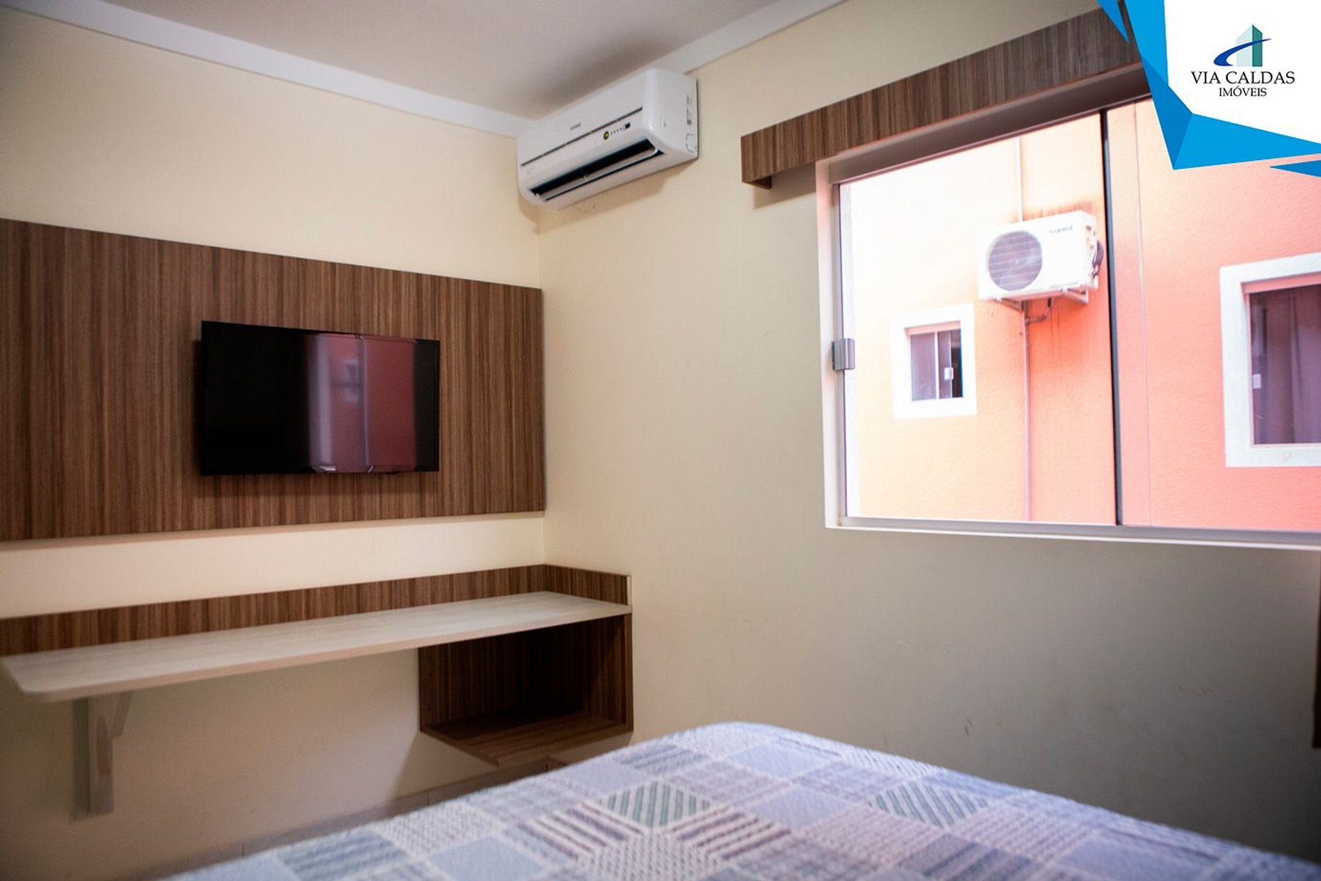 Apartamento contendo suite de casal com TV e ar condicionado, sala
