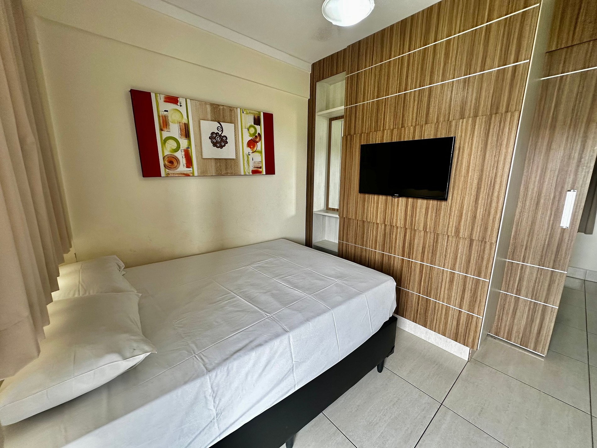 Apartamento contendo suite de casal com TV e ar condicionado, sala