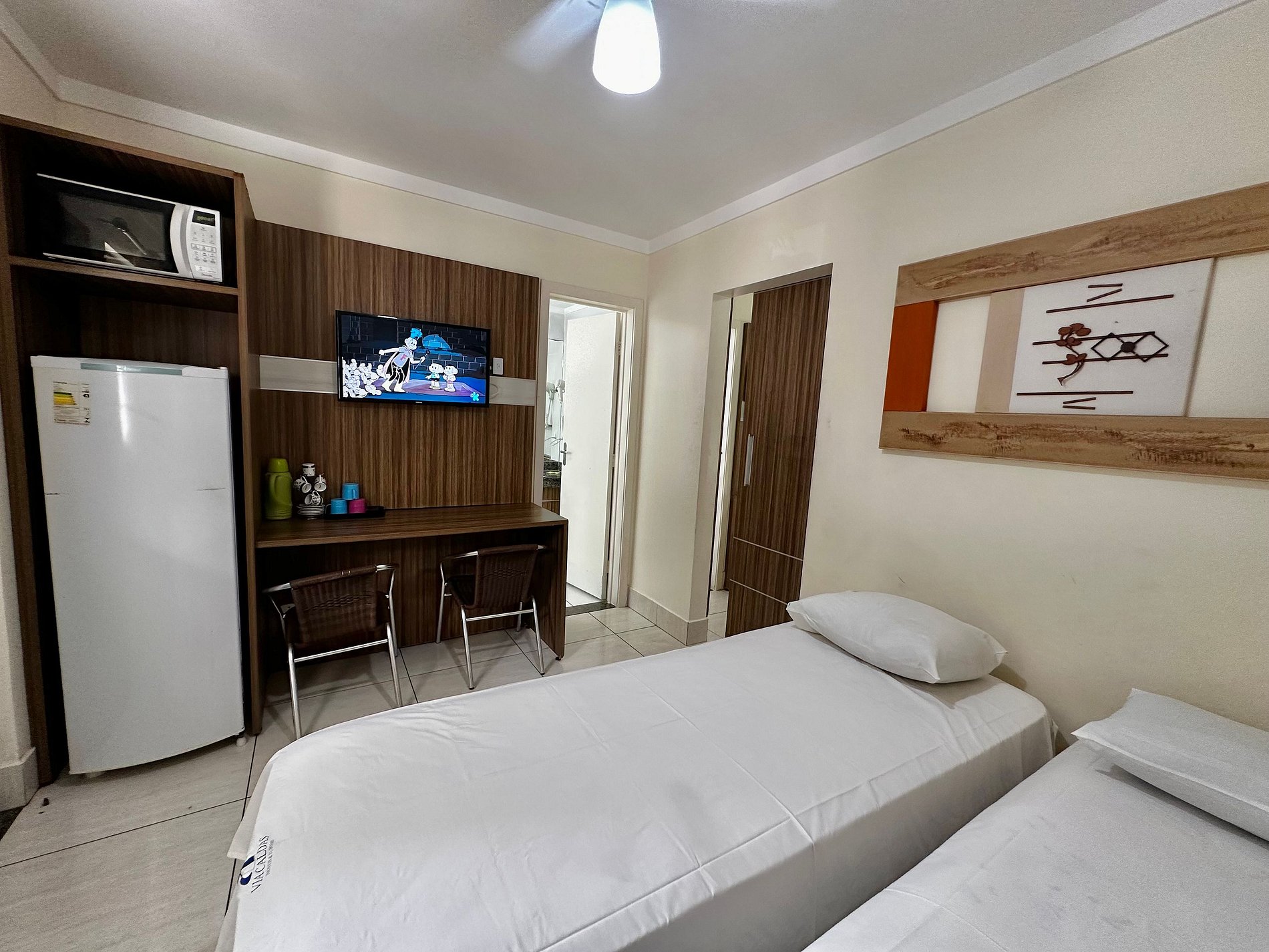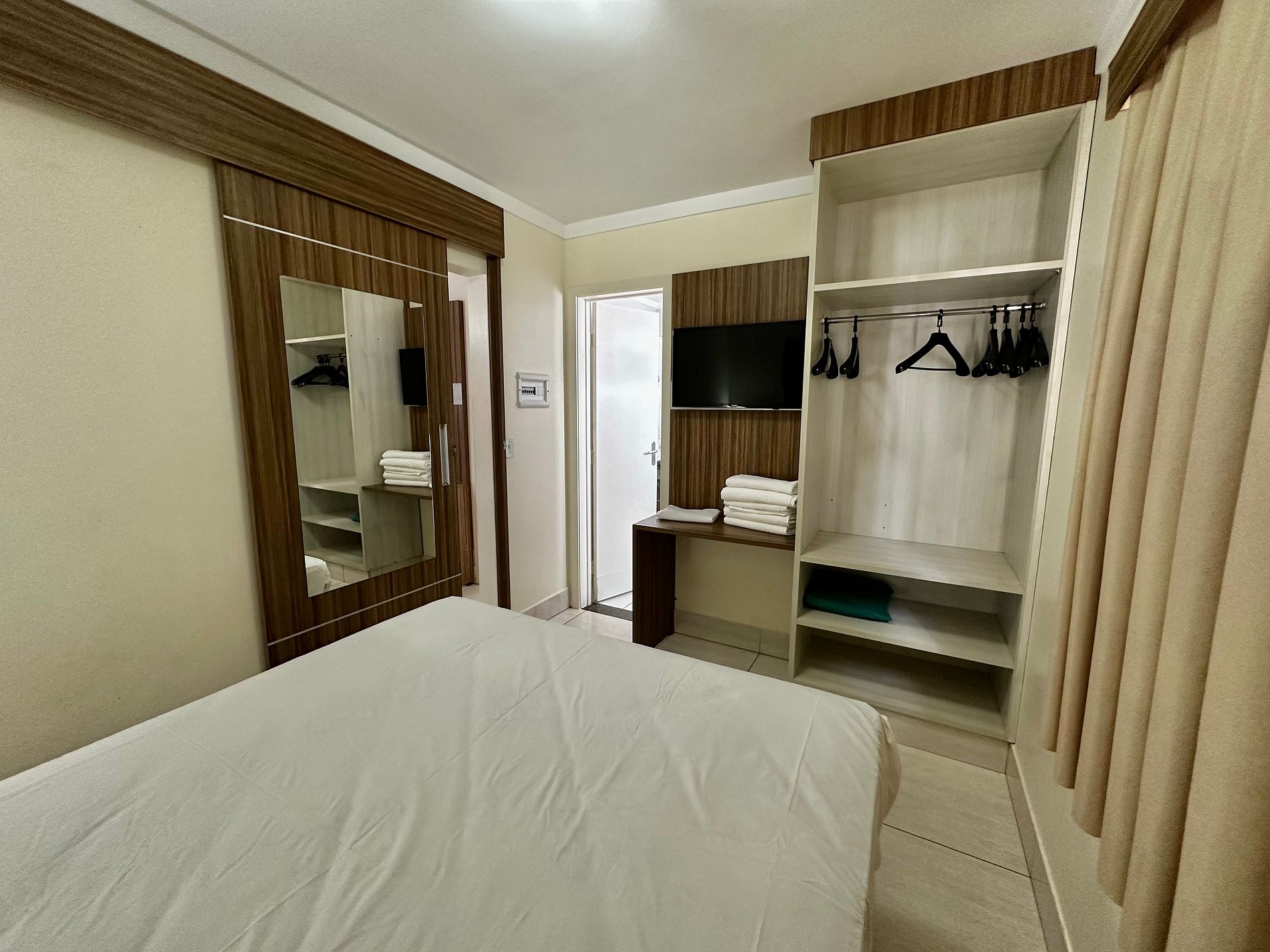 Apartamento contendo suite de casal com TV e ar condicionado, sala
