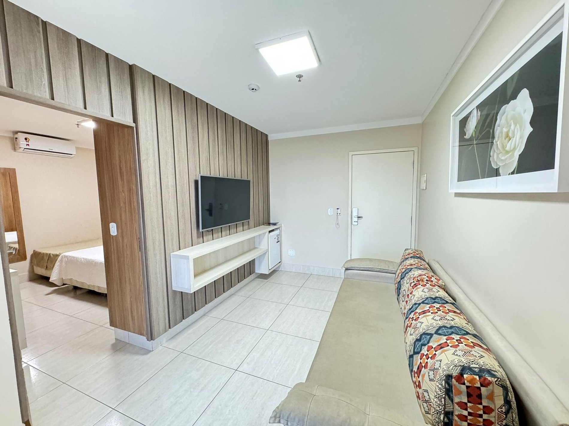 Apartamento contendo quarto de casal com tv e ar condicionado, sala com tv, ar condicionado, sofá cama de casal, frigobar. Varanda.