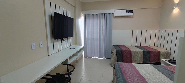 Suite contendo cama box de casal, cama box solteiro com auxiliar. TV, frigobar e microondas.
