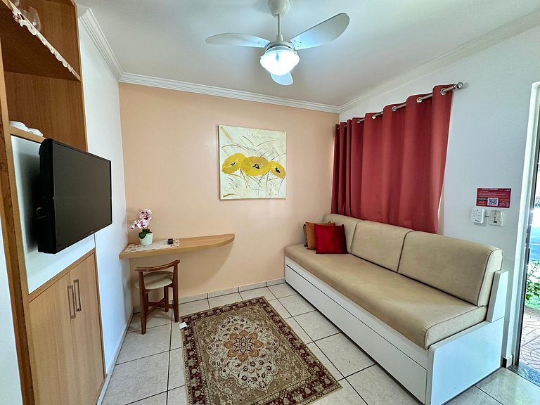 com sofá cama de casal, TV, ventilador de teto. Cozinha compacta com geladeira/frigobar e microondas.