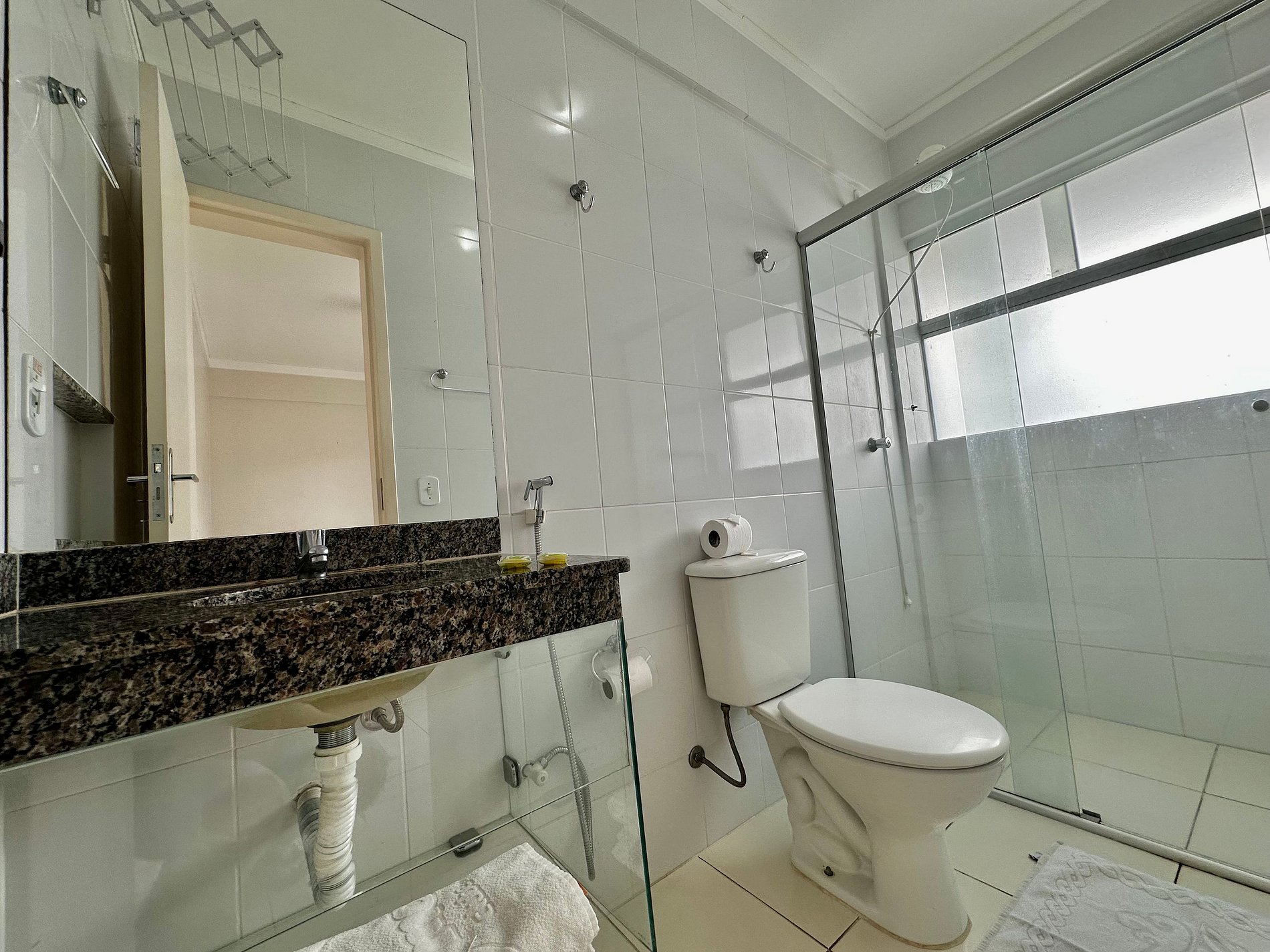 Apartamento de 1 quarto sendo suíte de casal com TV e ar-condicionado. Sala com TV, ventilador de teto, sofá cama de casal. Cozinha compacta com geladeira e microondas.