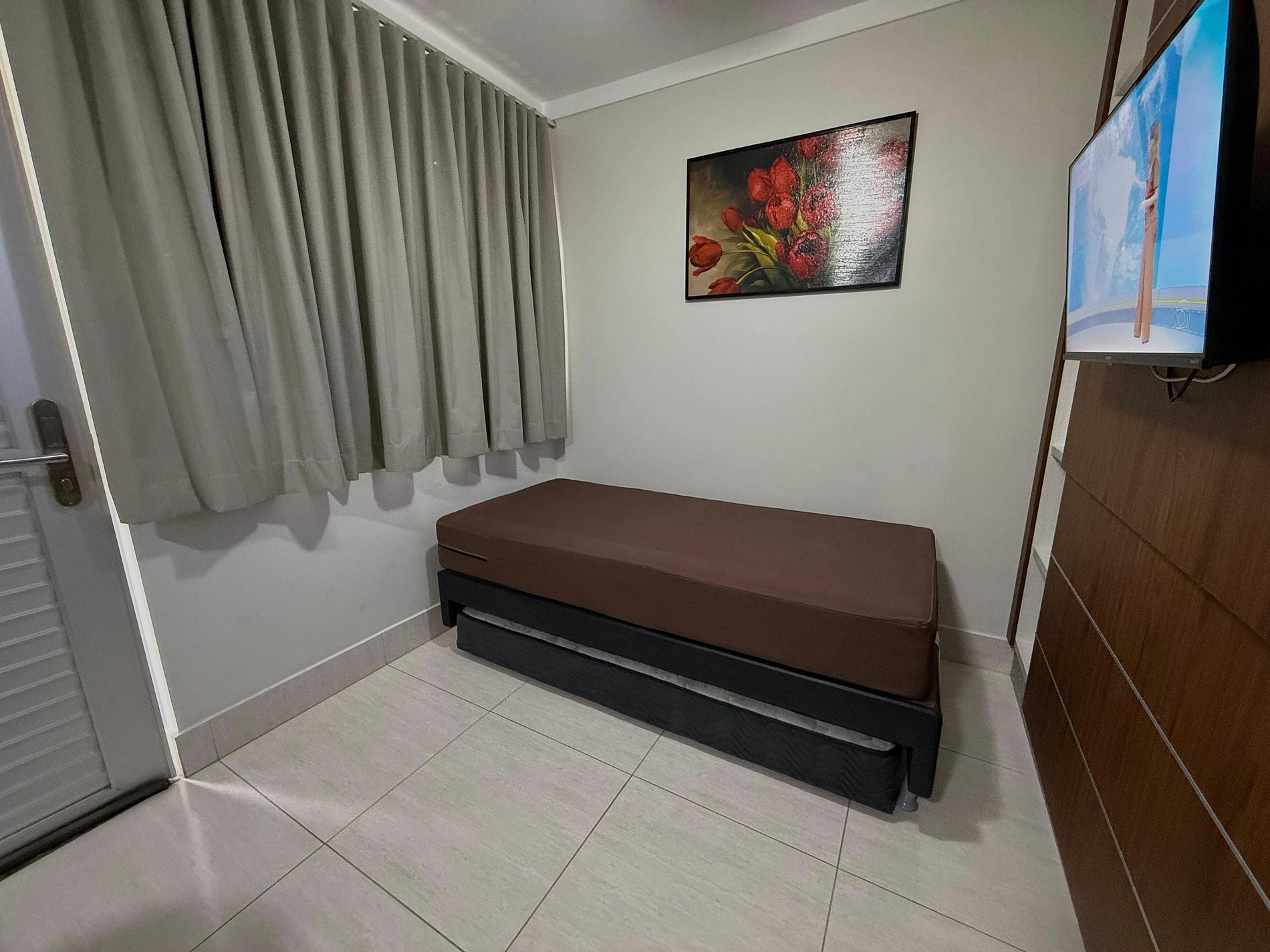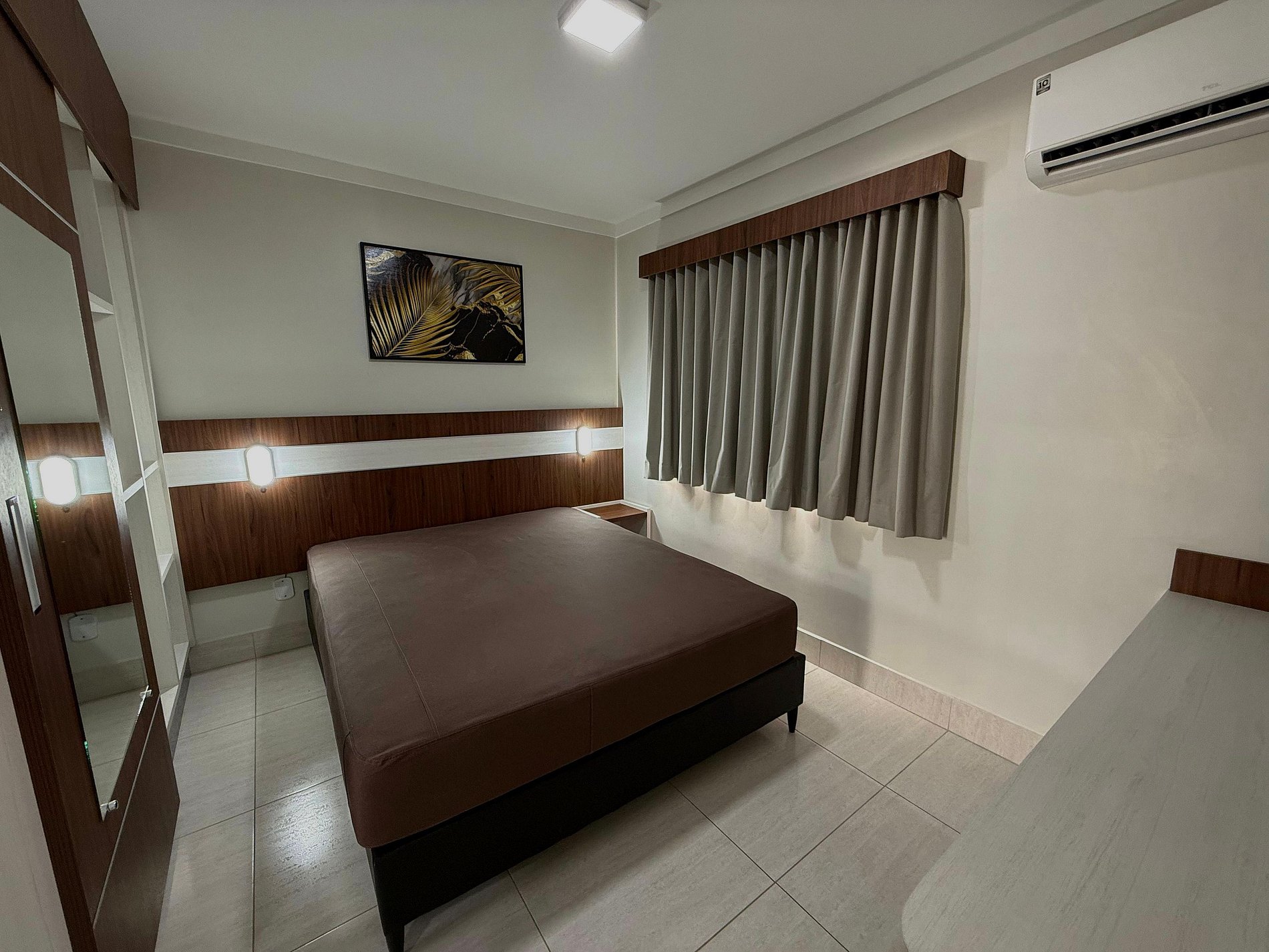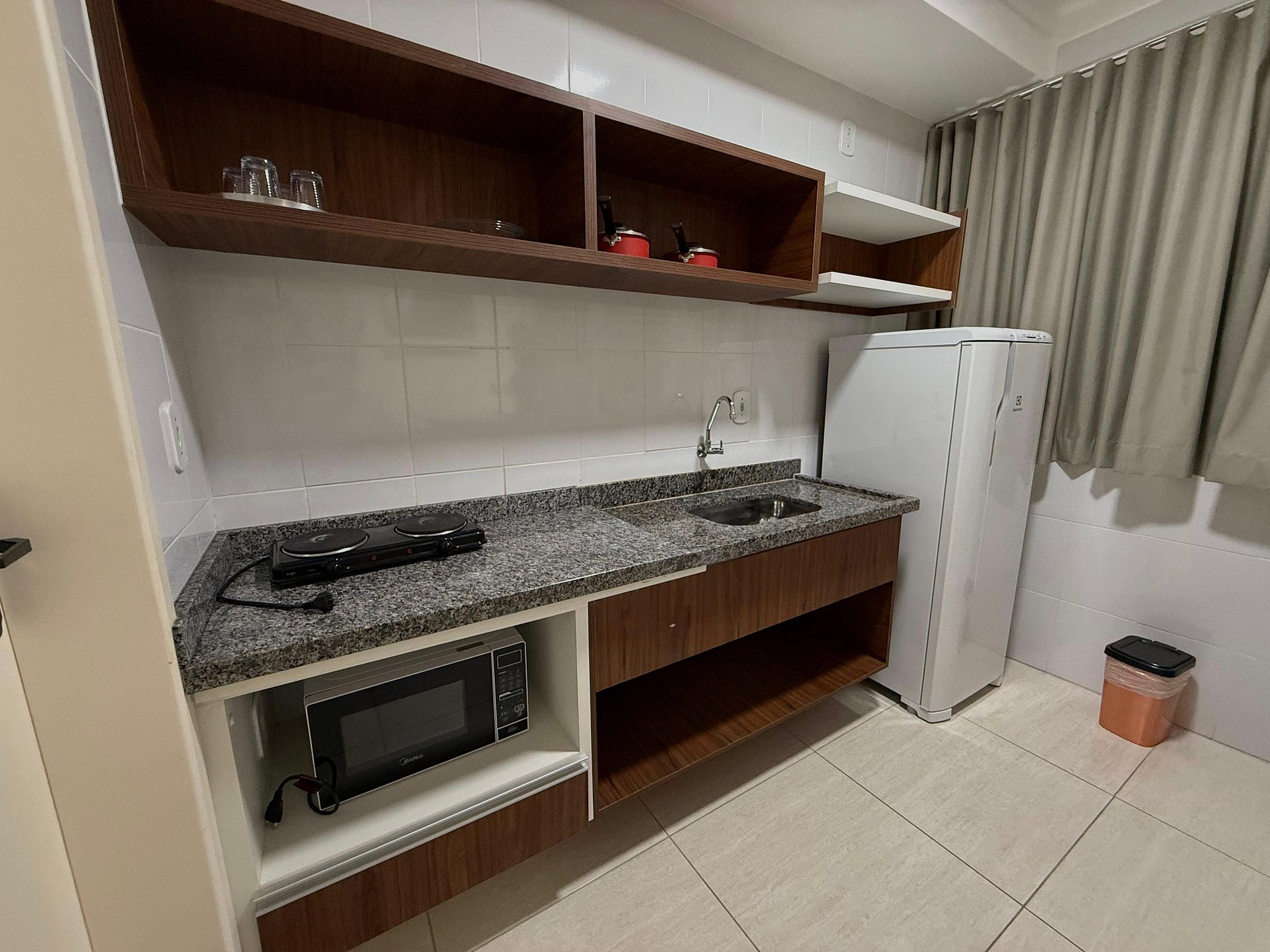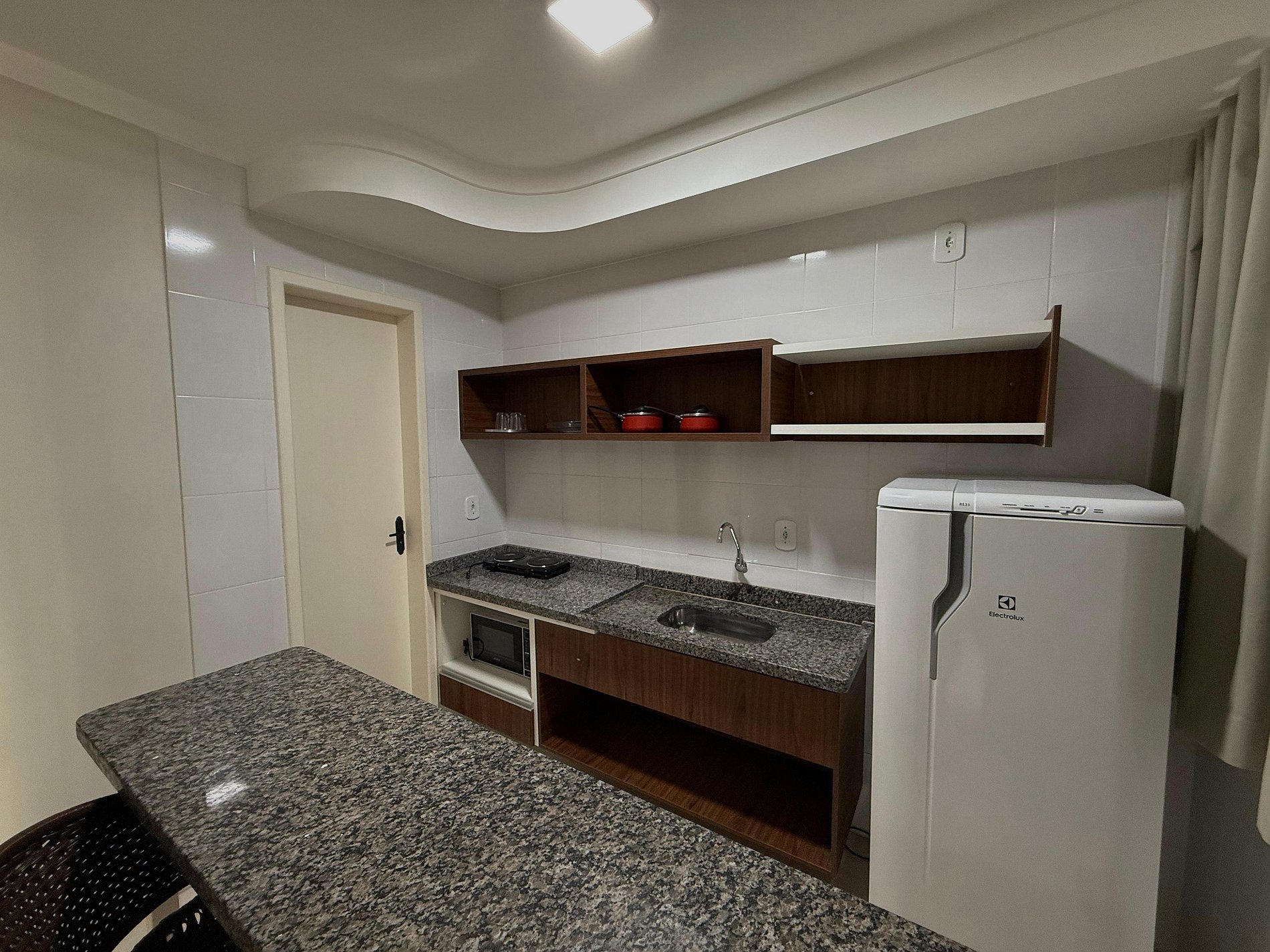 Apartamento contendo 1 suíte com cama de casal e ar condicionado, sala com cama de solteiro c/ auxiliar, cozinha com microondas, geladeira e utensílios básicos de cozinha.