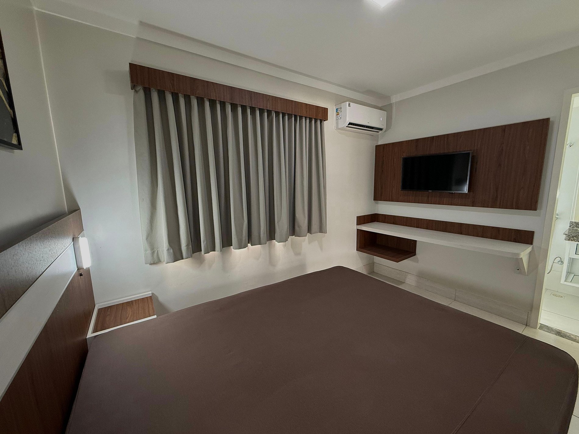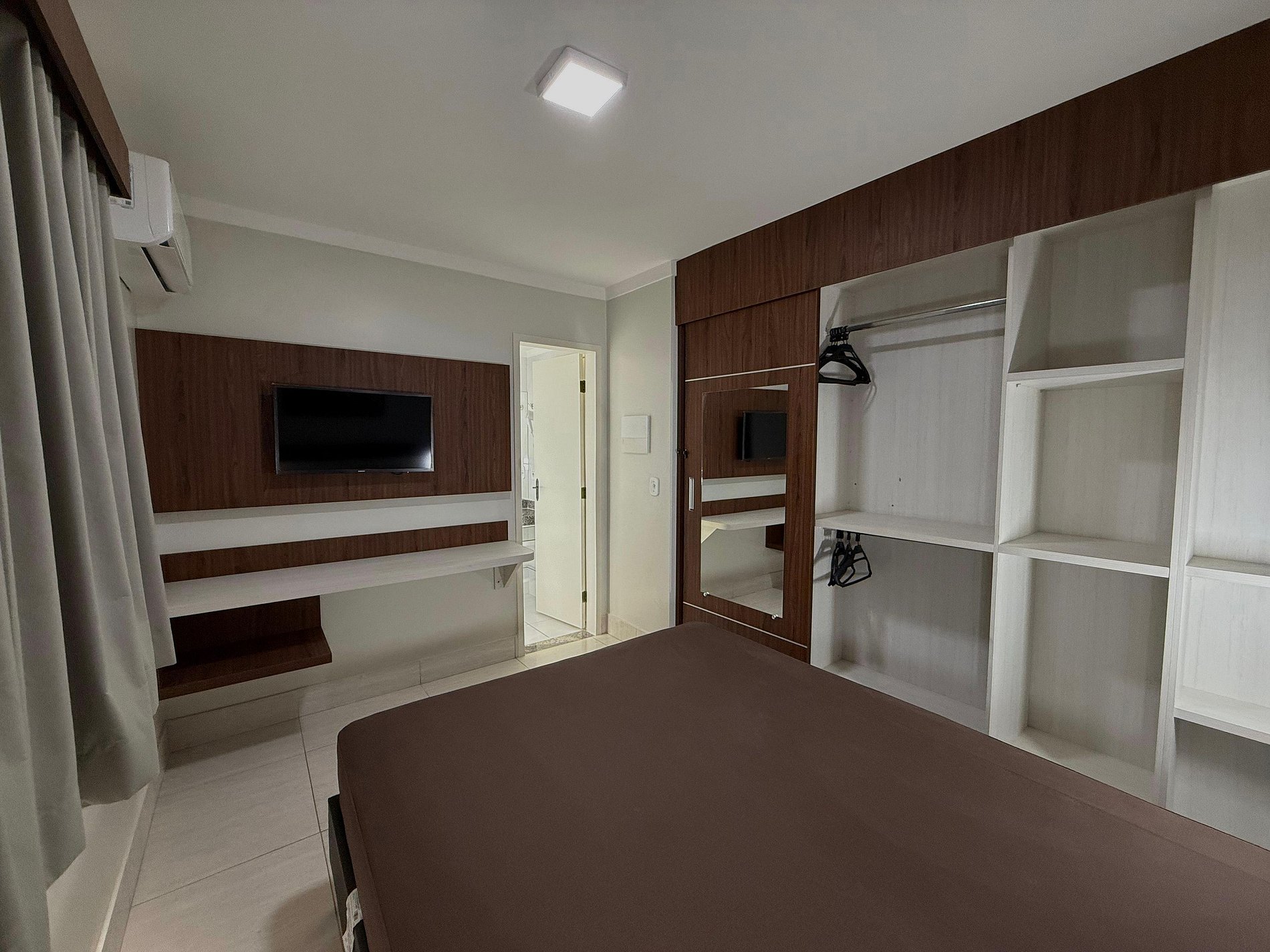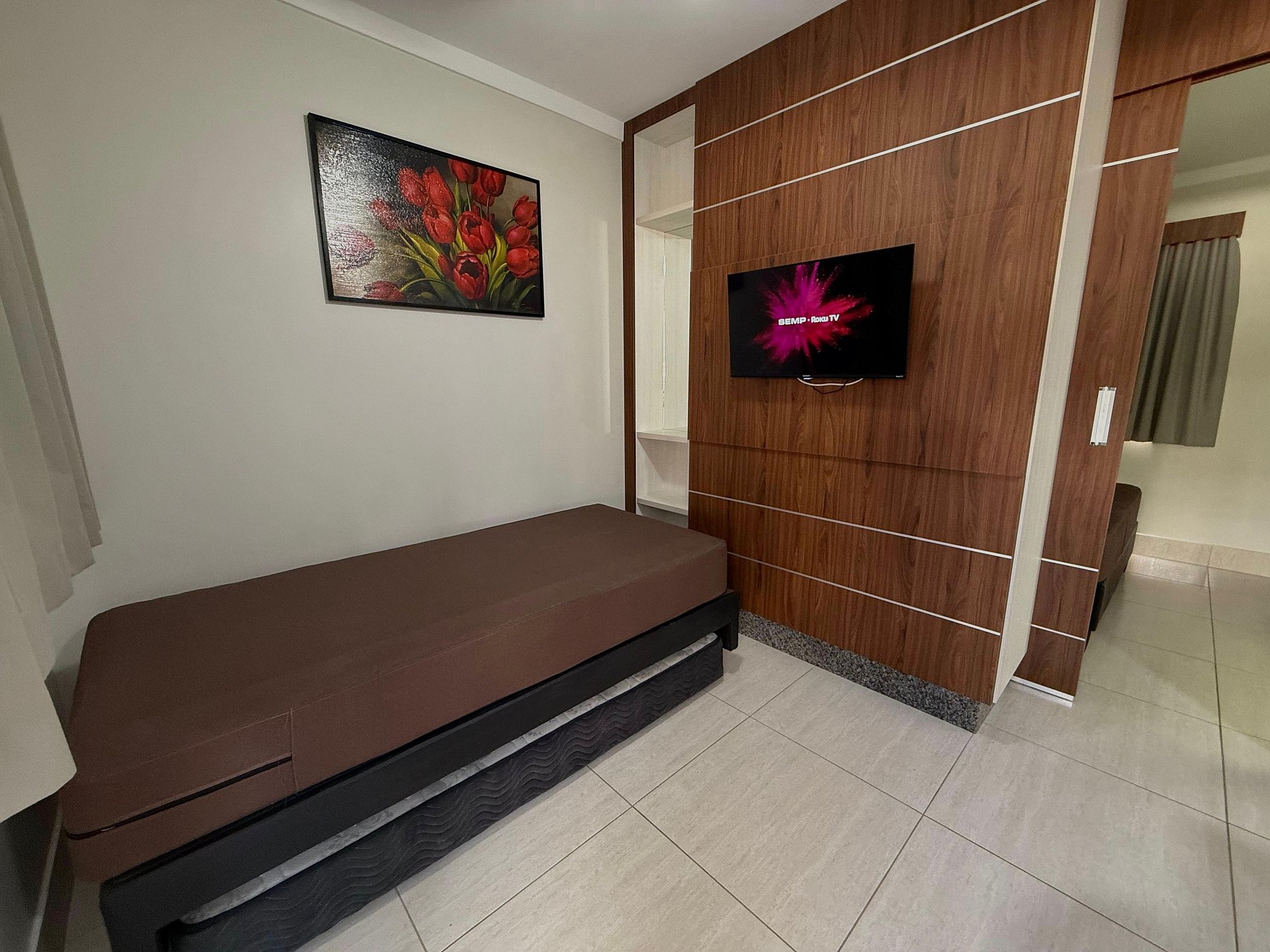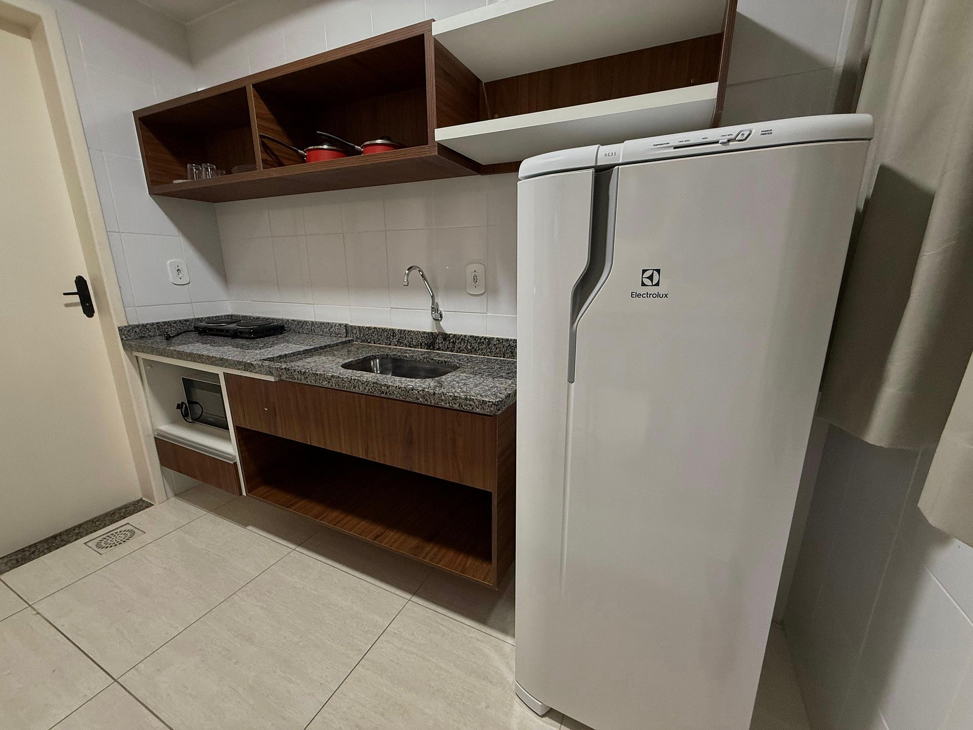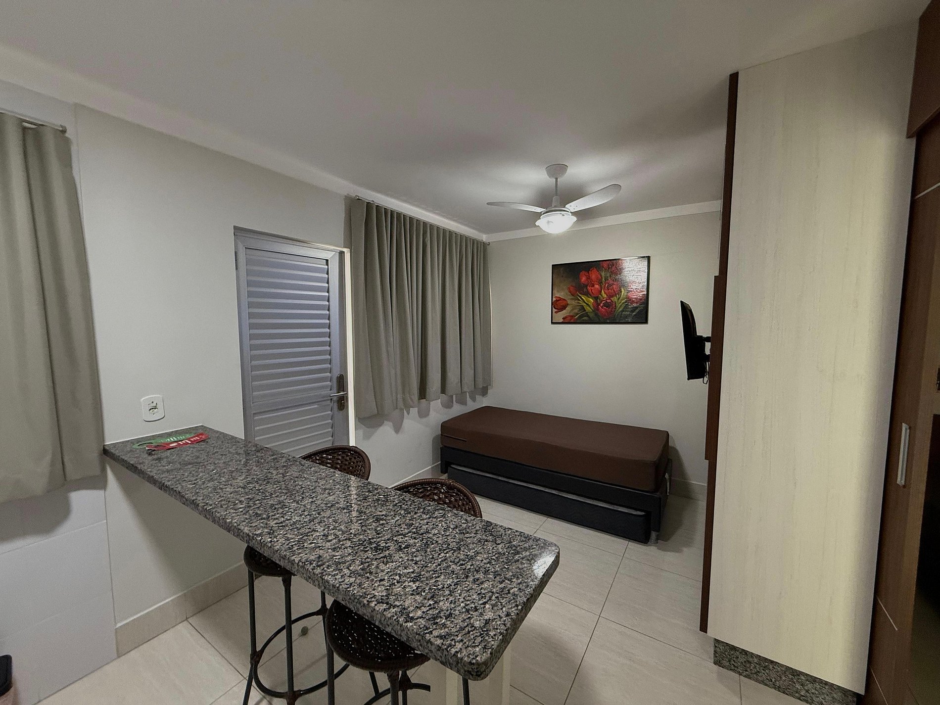 Apartamento contendo 1 suíte com cama de casal e ar condicionado, sala com cama de solteiro c/ auxiliar, cozinha com microondas, geladeira e utensílios básicos de cozinha.