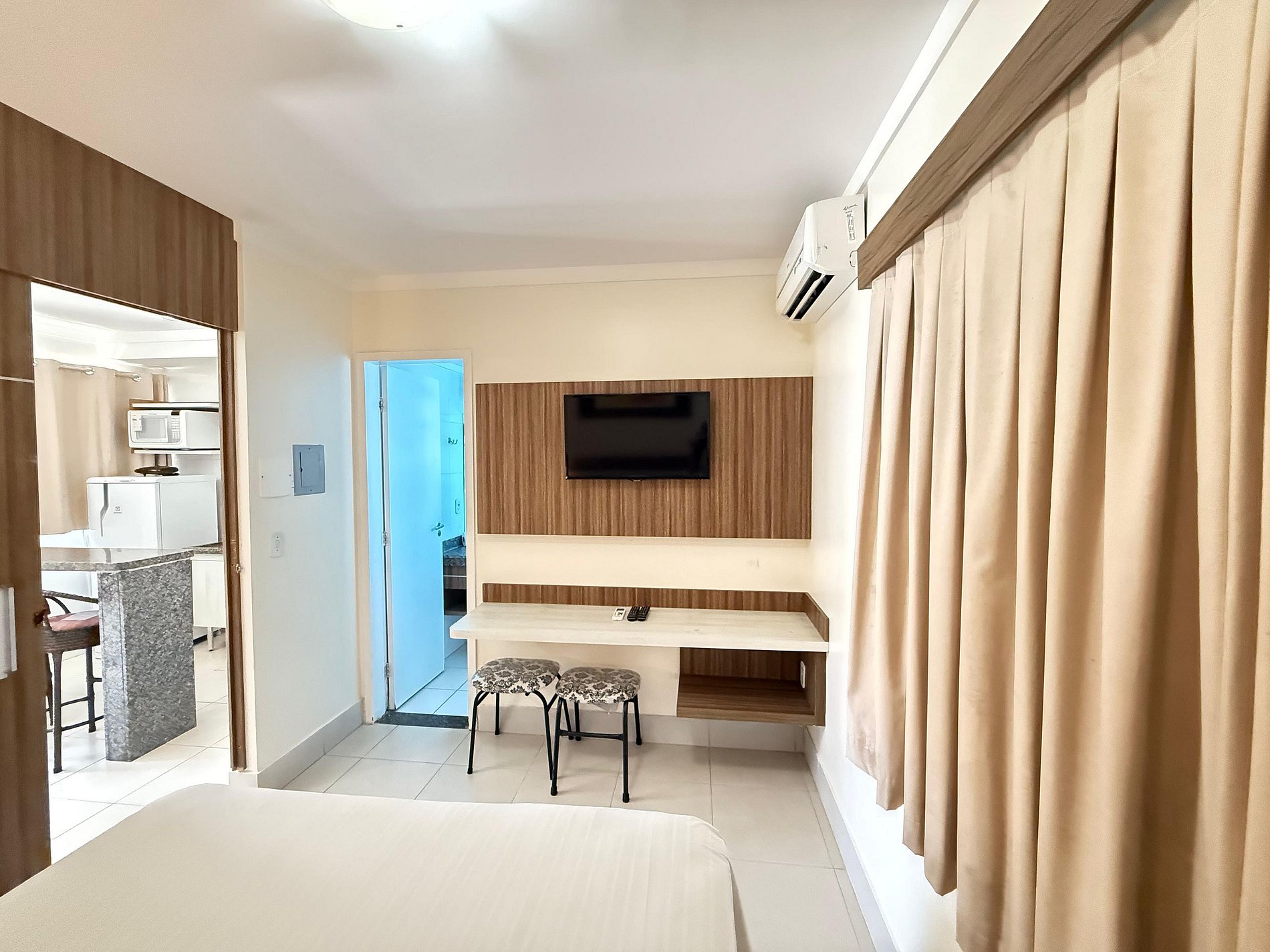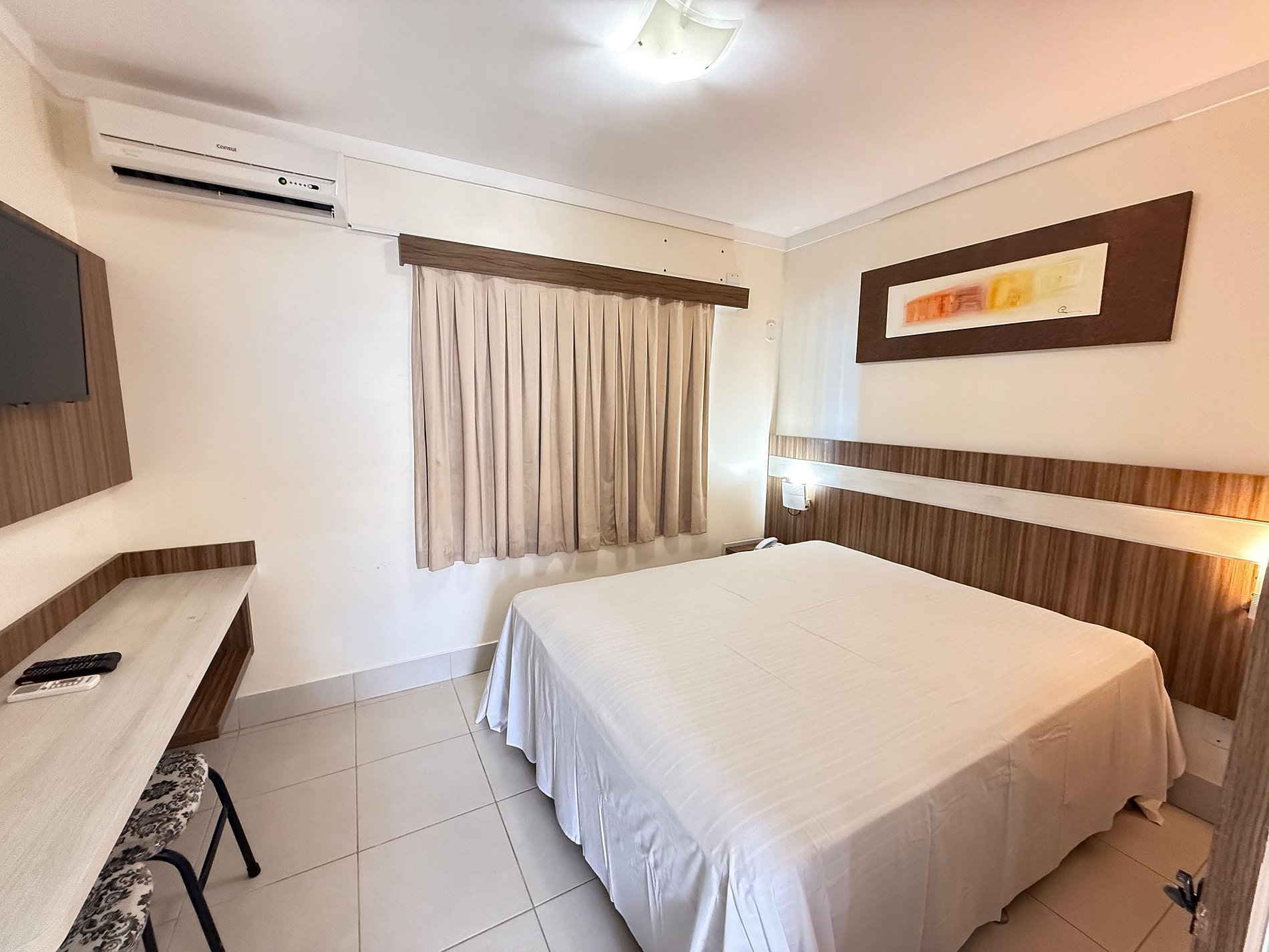 Suíte de casal com TV e ar condicionado.