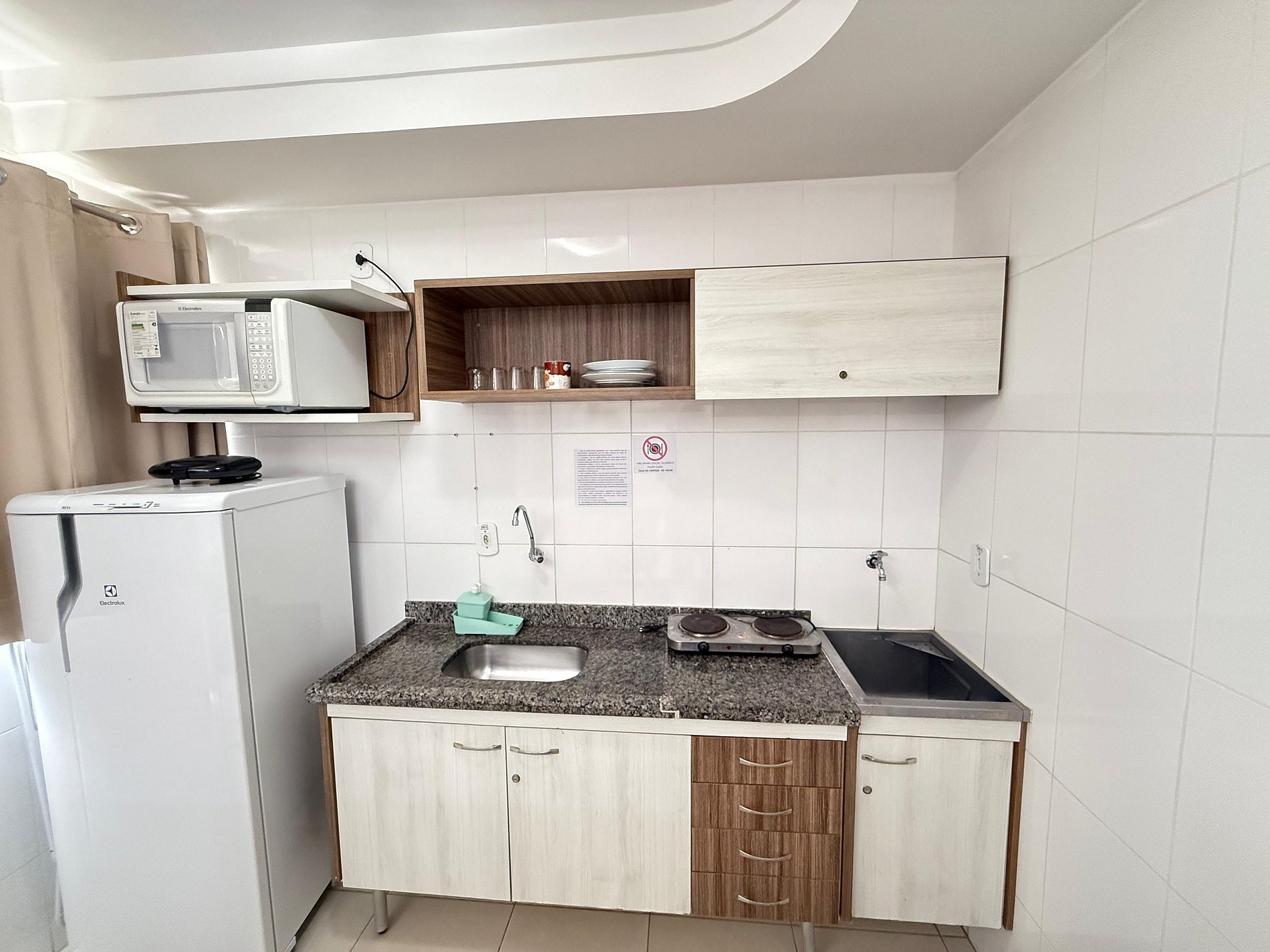 Cozinha compacta com geladeira, microondas, fogão elétrico e utensílios básicos.