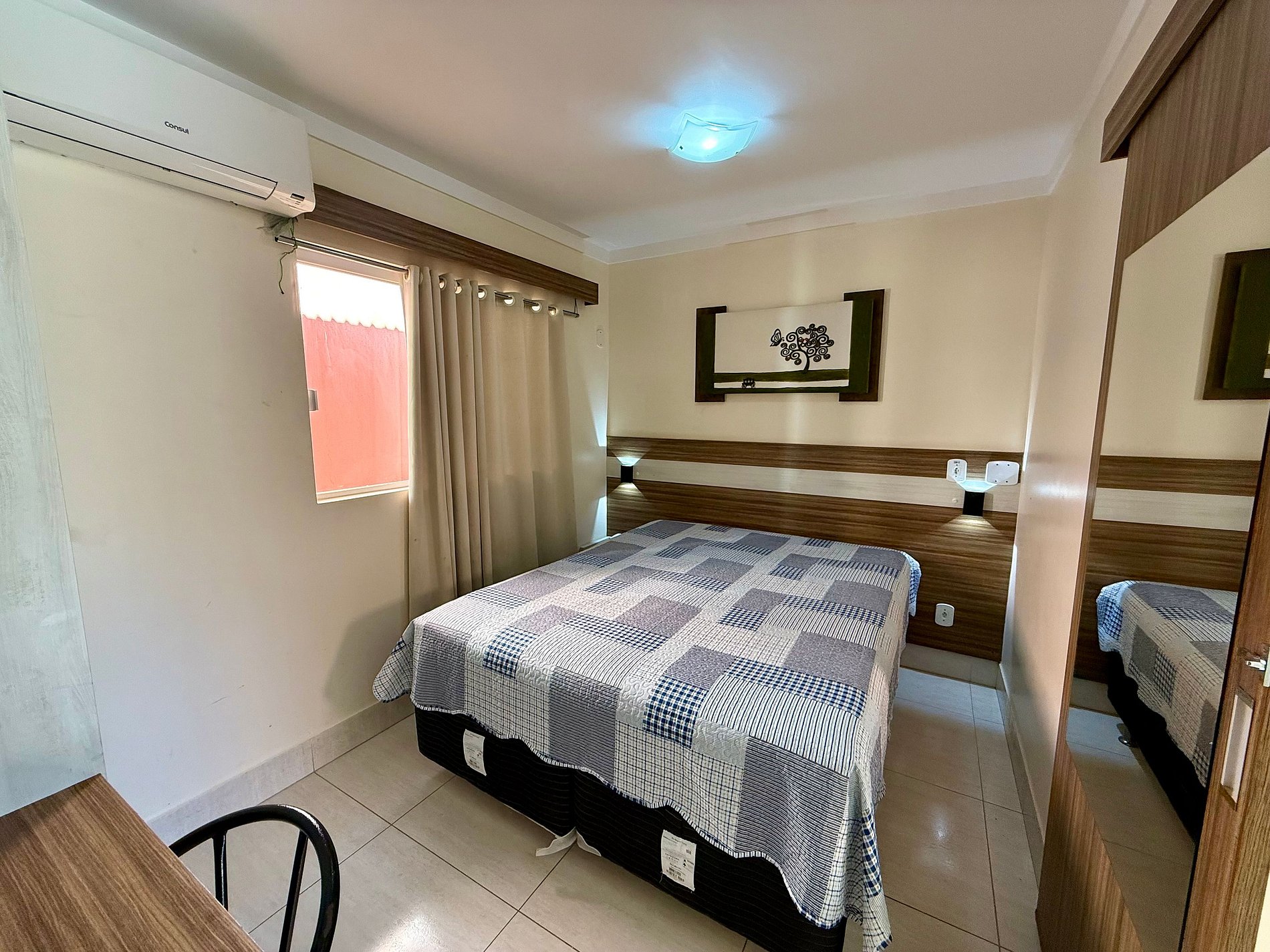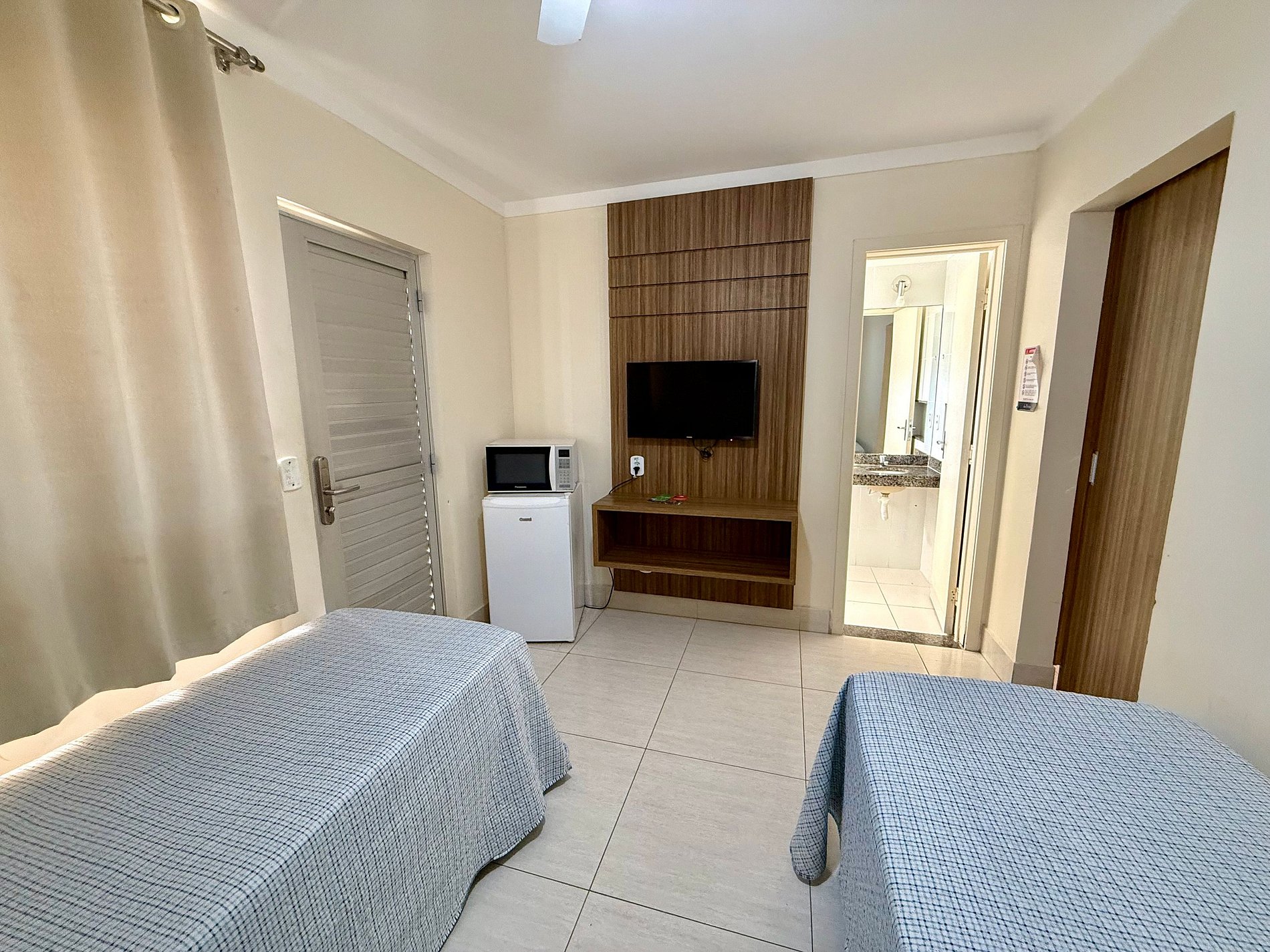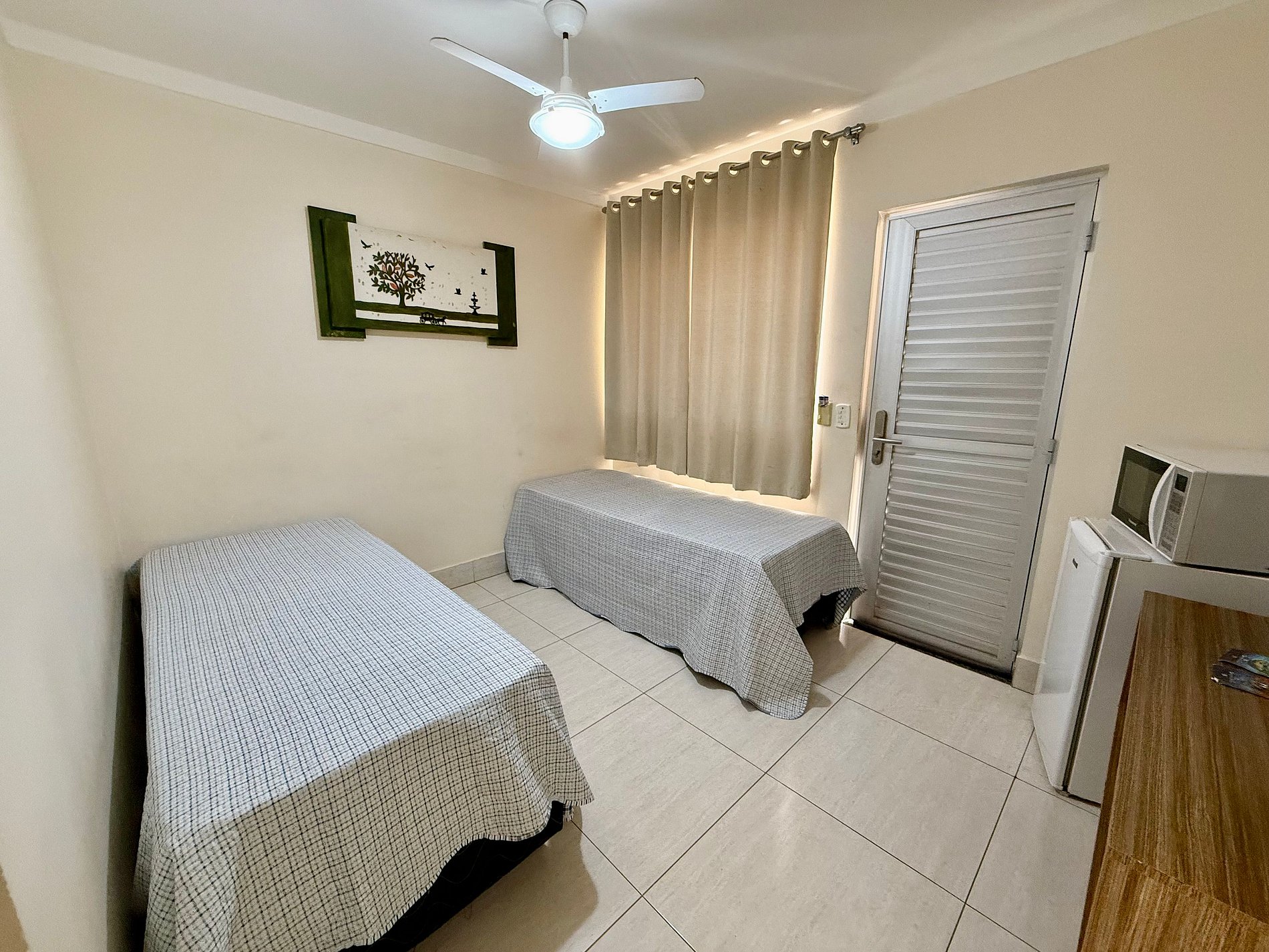 Apartamento contendo uma suíte de casal, com TV e ar condicionado. Sala com banheiro, duas camas de solteiro, TV, ventilador de teto, frigobar e microondas. Acomoda até 5 pessoas independente da idade.