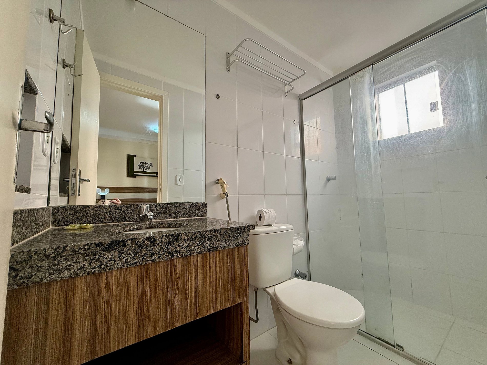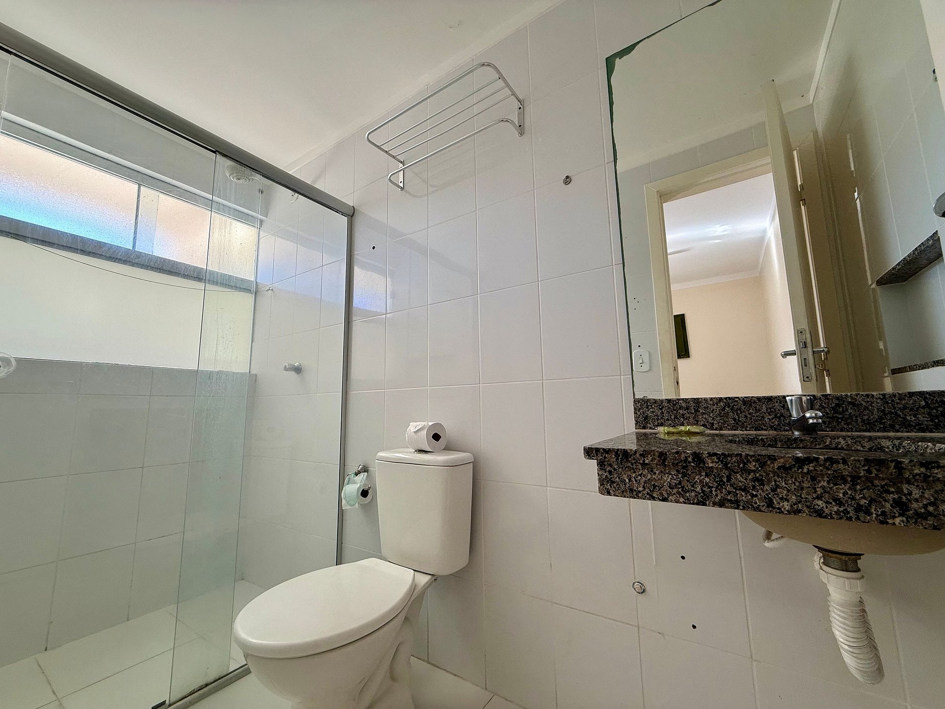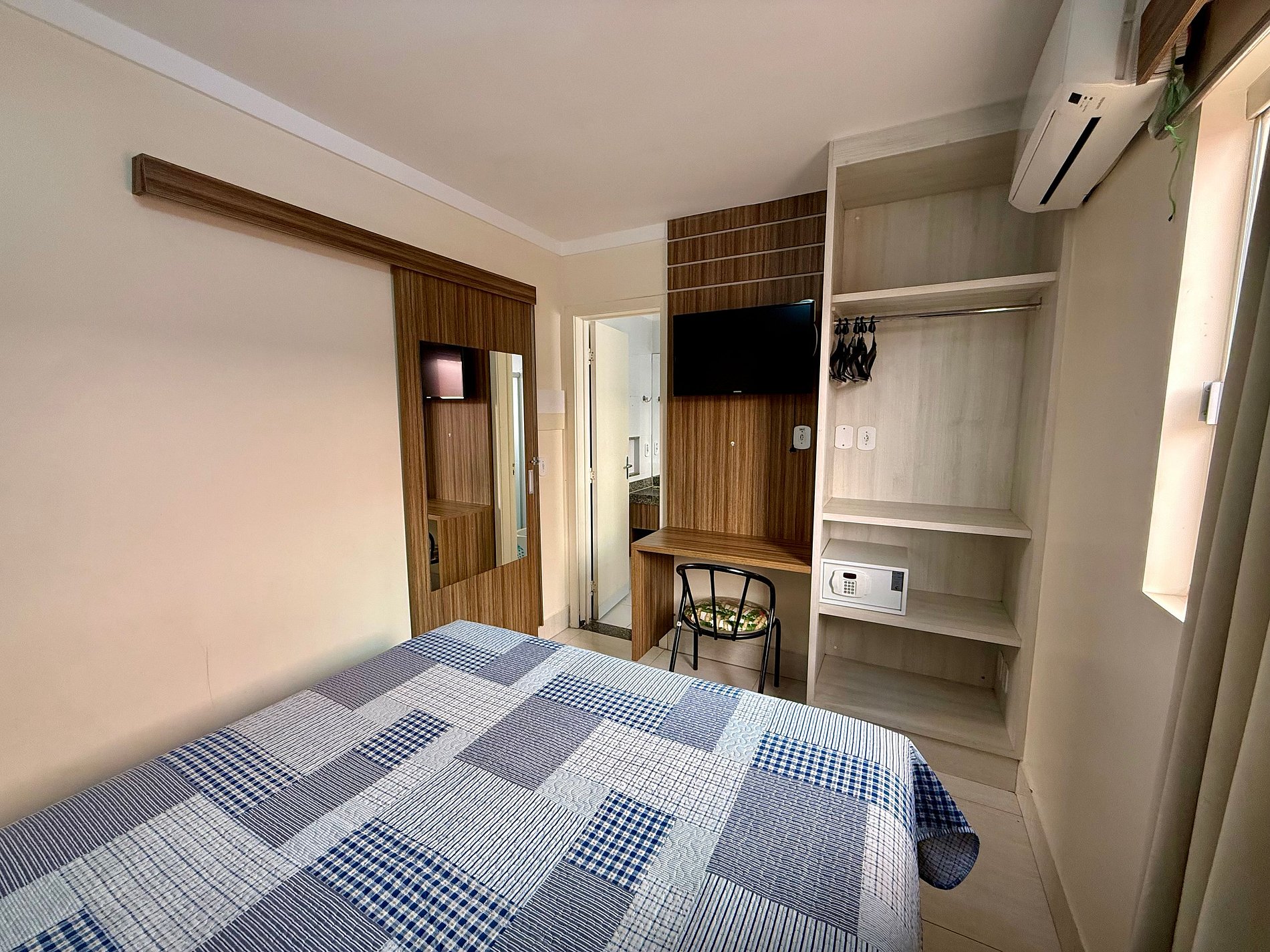 Apartamento contendo uma suíte de casal, com TV e ar condicionado. Sala com banheiro, duas camas de solteiro, TV, ventilador de teto, frigobar e microondas. Acomoda até 5 pessoas independente da idade.