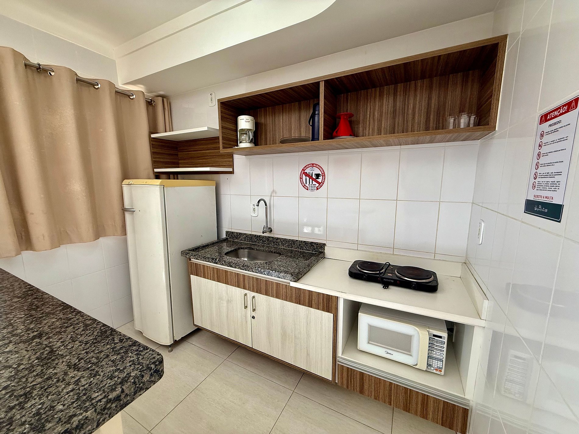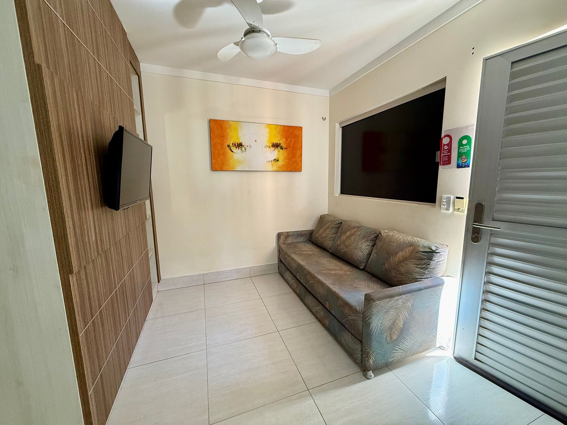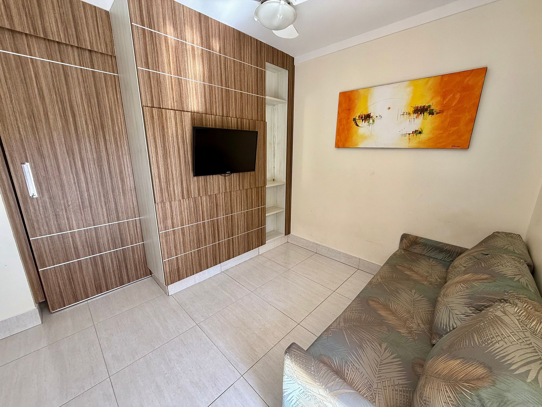 Apartamento contendo uma suíte de casal, com TV e ar condicionado. Sala com sofá-cama, TV, ventilador de teto. Cozinha compacta com geladeira, fogão elétrico e microondas. Acomoda até 5 pessoas independente da idade.